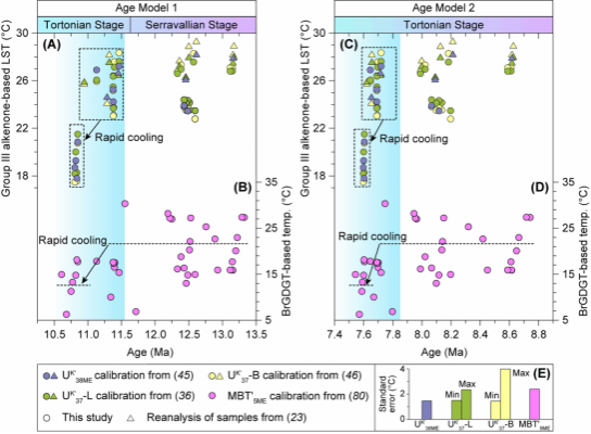 基于上述发现,本研究对柴达木盆地红沟剖面中–上中新统湖相泥岩地层进行了高分辨率密集采样,运用有机地球化学生物标志物技术,系统重建了古湖面温度演化,并进一步估算盆地的古高程变化。研究发现,多数样品中仅含Group III 长链烯酮,少数样品中则同时存在Group III 与 Group II 长链烯酮的混合物。为此,研究采用了最新发展的 UK’38ME (C38甲基烯酮的不饱和度) 温度校正方法,该方法可有效避免烯酮种属混合带来的温度校正误差,从而实现更为准确的古温度重建。重建结果表明,柴达木盆地在晚中新世经历了一次显著的降温事件,古湖泊表面温度下降幅度达 6.6 ± 1.8 °C(图2)。同时,基于源自细菌的生物标志物brGDGTs(支链甘油二烷基甘油四醚)分析的古温度记录亦揭示湖泊水柱在同期发生降温,进一步佐证了这一降温事件的存在(图2)。根据前人建立的两种不同的柴达木盆地新生代地层年代模型判断,该降温事件可能发生在约1130–1080万年前,或770–760万年前。