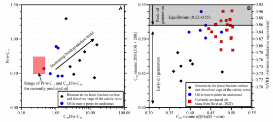 该研究成果表明走滑断裂带内微裂缝作用不容忽视,另外大的构造活动期断裂带流体活动具有间歇性,长达上亿年的抬升背景下,只有在断裂强烈活动时,油气才会发生明显的再运移与次生蚀变(如生物降解)。该研究为深入理解走滑断裂带内基质孔隙和裂缝中流体流动以及构造抬升过程油气的保存和调整改造提供了新的视角。
