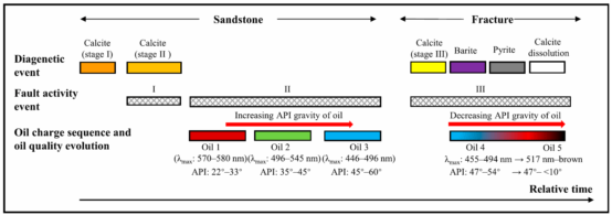 2、断缝体油藏中砂岩孔隙和裂缝具有差异流体演化过程(图2)。早期砂岩中强烈的碳酸盐胶结导致储层致密化,随后成熟度较低的油质偏重的原油则主要聚集在裂缝和残留的大孔隙中,晚期成熟度高的油质偏轻的原油则聚集在残留的砂岩孔隙中。在后期的构造抬升过程,裂缝中的油则优先被降解,而砂岩孔隙中的油则保存较好,导致了断缝体油藏砂岩孔隙和裂缝中差异流体演化和次生改造(图3)。