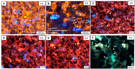 图1. 显微照片展示了早期(A、D、E)和相对晚期(B、C)的方解石胶结作用以及微裂缝控制的方解石胶结(A-E中白色箭头)和油运移(F)。