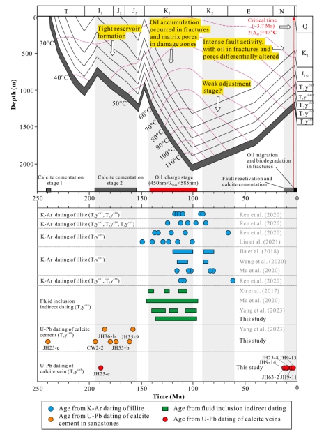 本研究以鄂尔多斯盆地南缘泾河油田三叠系致密砂岩中发育的断缝体油藏为例,创新性地整合了方解石 U-Pb 定年、流体包裹体、团簇同位素(Δ47)、 有机地球化学等多种方法,对致密砂岩储层砂岩孔隙和裂缝中烃类和非烃流体演化过程进行系统重构。取得的主要成果认识如下: