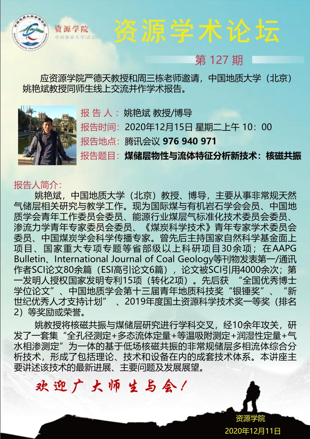 【12月15日】第127期资源学术论坛:姚艳斌学术报告