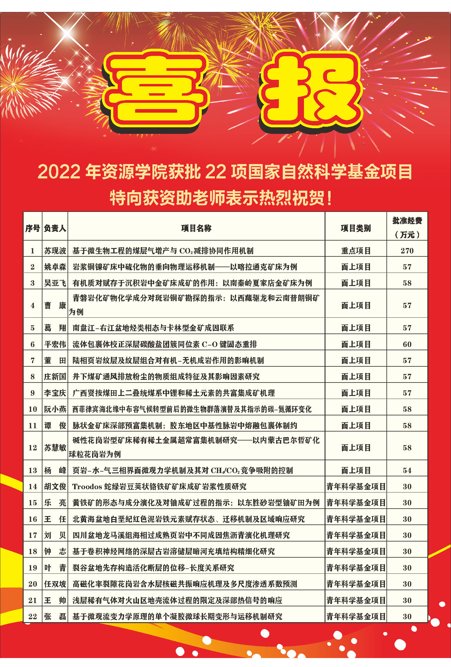 基金立项在2019、2020、2021年3个大年的情况下,继续保持良好发展态势,共有22个项目获得立项资助,其中,重点项目1项、面上项目12项、青年科学基金项目9项,资助直接经费1228万元。