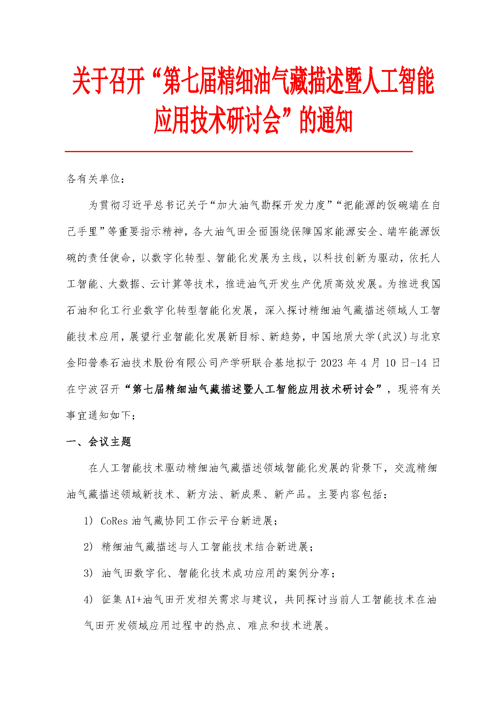 关于召开“第七届精细油气藏描述暨人工智能应用技术研讨会”的通知