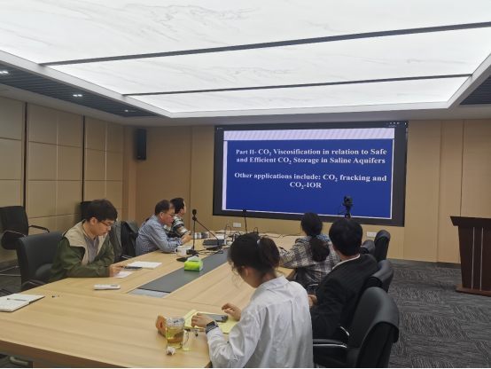 Frioozabadi院士围绕“分子结构对相界面的影响”、“CO2界面粘弹性在咸水层封存中的作用”和“流体在裂缝中的模拟”三个主题展开报告。首先,他结合近期的研究成果,揭示了界面粘弹性在提高采收率中的重要性,通过在注入水中加入约100ppm的功能分子,可以大幅提高原油采收率。之后,他详细阐述了CO2增黏作用在咸水层封存的影响,二氧化碳能够快速降低大多数岩石的界面能量密度和突破压力,在高度非均质和层状介质中,高渗透含水层的增黏效果会显著增加CO2的溶解。最后,他展示了CO2压裂及裂缝扩展数值模拟。