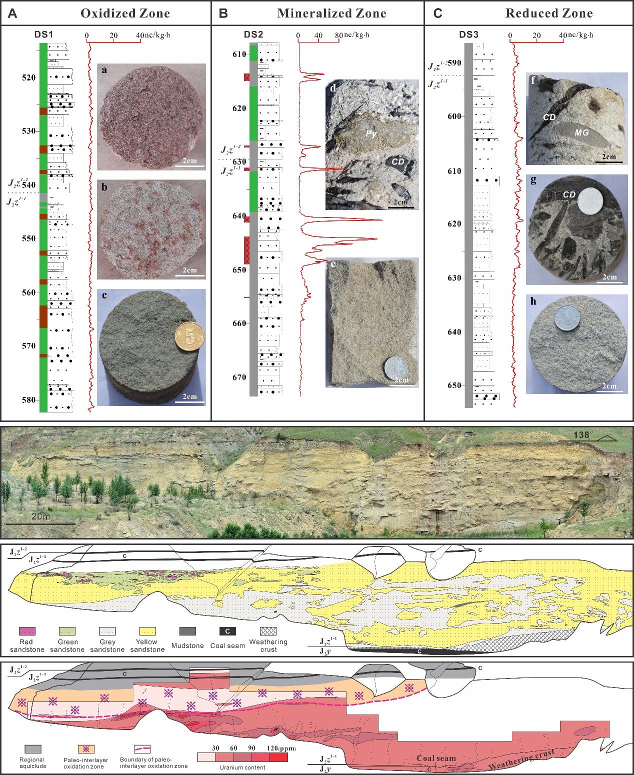 焦养泉教授团队的博士后乐亮(合作导师:赵军红教授)选取我国北方最重要的产铀盆地之一——鄂尔多斯盆地的东胜铀矿田为研究对象,该矿田铀储层经历了复杂的流体事件,包括(1)层间氧化作用;(2)烃类流体二次还原作用;和(3)地表氧化作用。在细致的野外露头剖面写实与钻孔岩心编录基础上,结合环境敏感参数与微量U-Th测试,笔者重点对铀储层中不同岩石地球化学类型砂岩开展了微区矿物学与同位素地球化学分析,对氧化-还原微环境的变化和成矿过程进行了深入探讨,取得了如下主要认识: