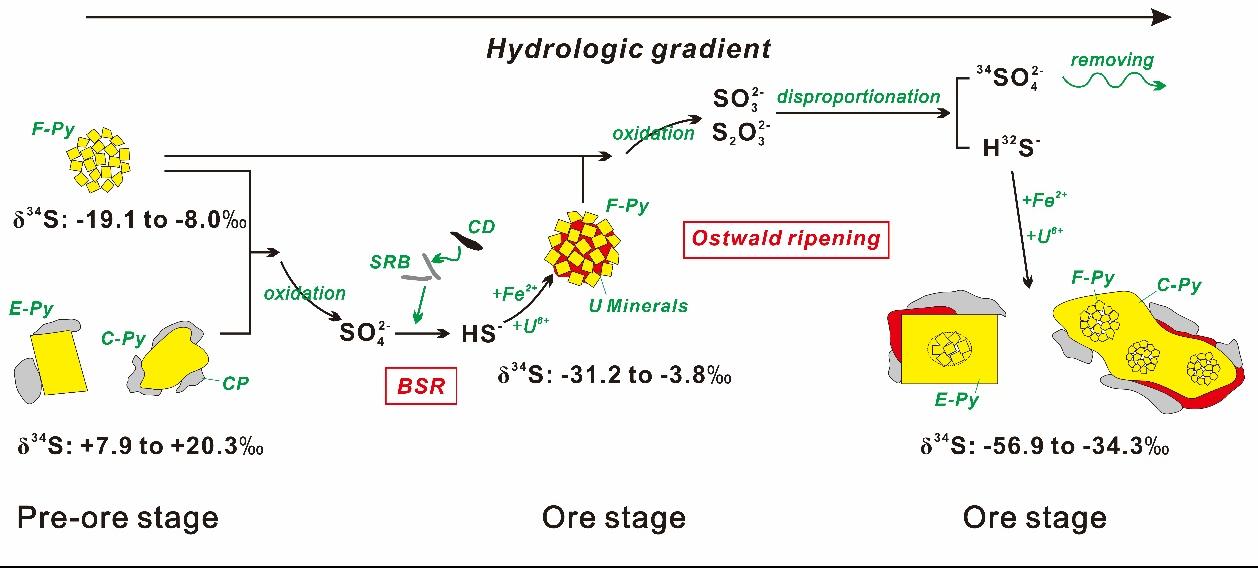 (3)黄铁矿存在三种形态类型:莓状、自形和胶状,与铀矿物紧密共生(图3)。早期研究发现,黄铁矿形态存在转化关系:莓状黄铁矿被自形/胶状黄铁矿包裹。SIMS硫同位素显示,成矿前黄铁矿δ34S组成为-19.1‰ ~ +20.3‰,而成矿期莓状黄铁矿的δ34S组成为-31.2‰ ~ -3.8‰,成矿期自形+胶状黄铁矿的δ34S组成为-56.9‰ ~ -34.3‰。因此,解释莓状黄铁矿为成矿前黄铁矿提供硫源,经细菌硫酸盐还原反应的生物成因,而自形+胶状黄铁矿为莓状黄铁矿提供硫源,经Ostwald Ripening过程,发生歧化反应的化学成因(图4)。
