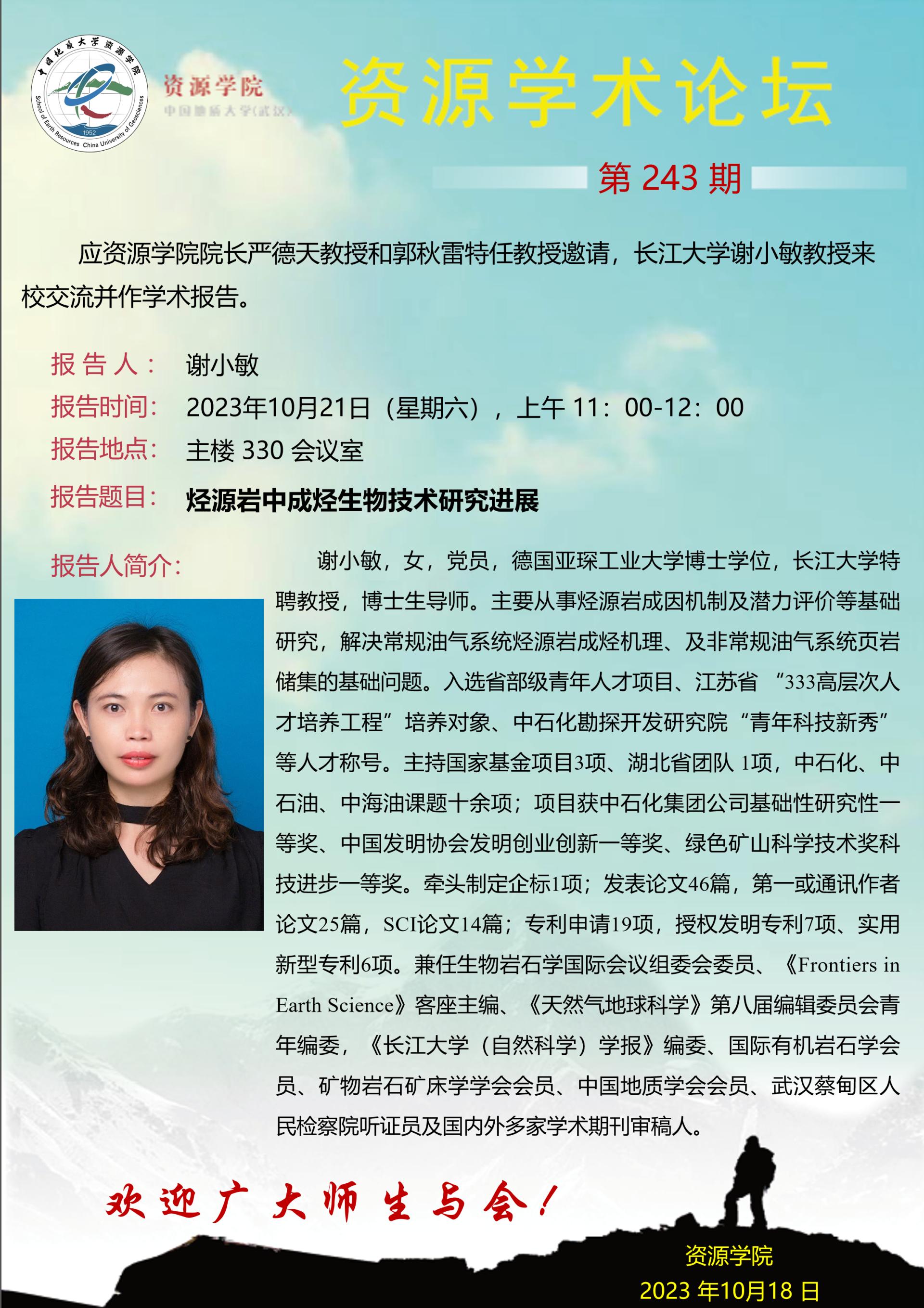 【10月21日】第243期资源学术论坛:谢小敏学术报告