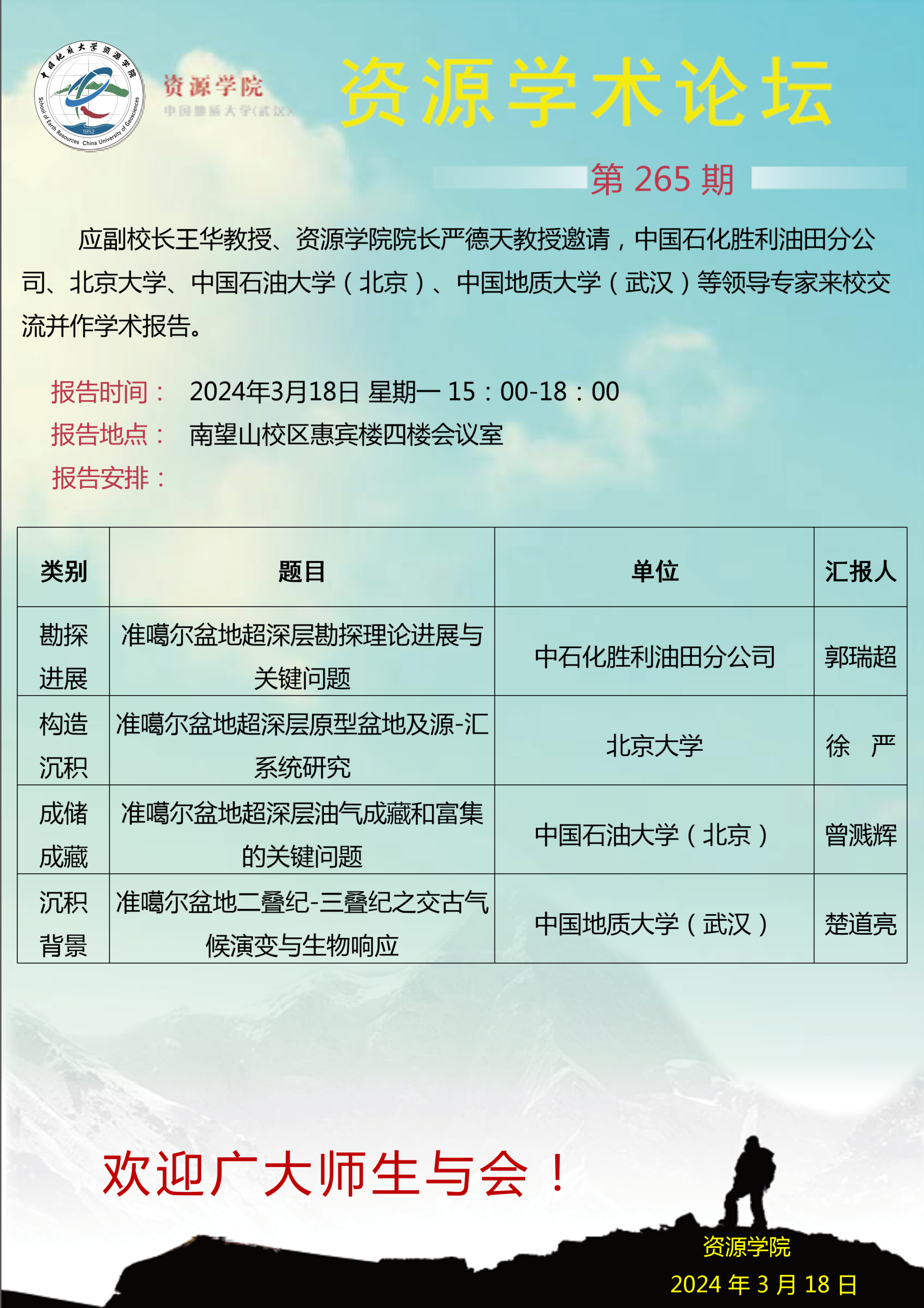 【3月18日】第265期资源学术论坛:郭瑞超、徐严、曾溅辉、楚道亮学术报告