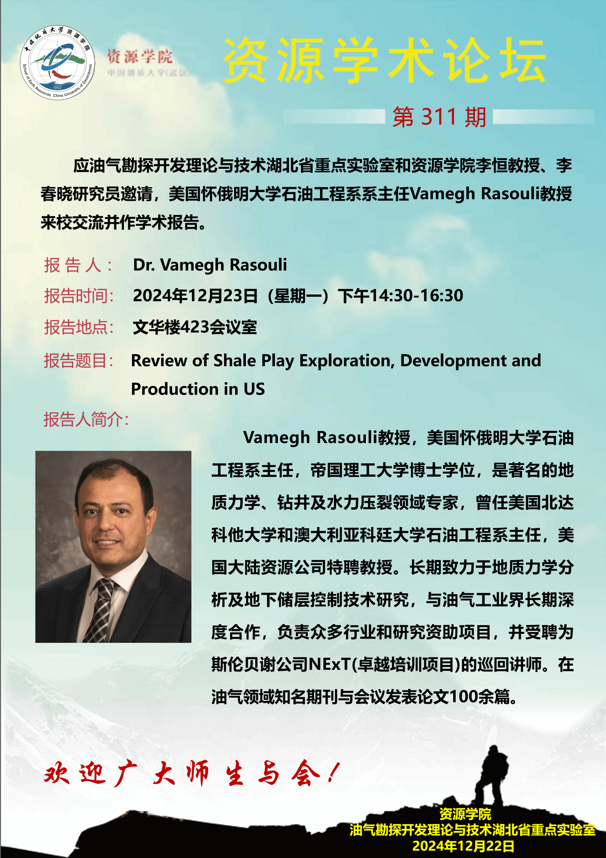 【12月23日】第311期资源学术论坛:Vamegh Rasouli学术报告