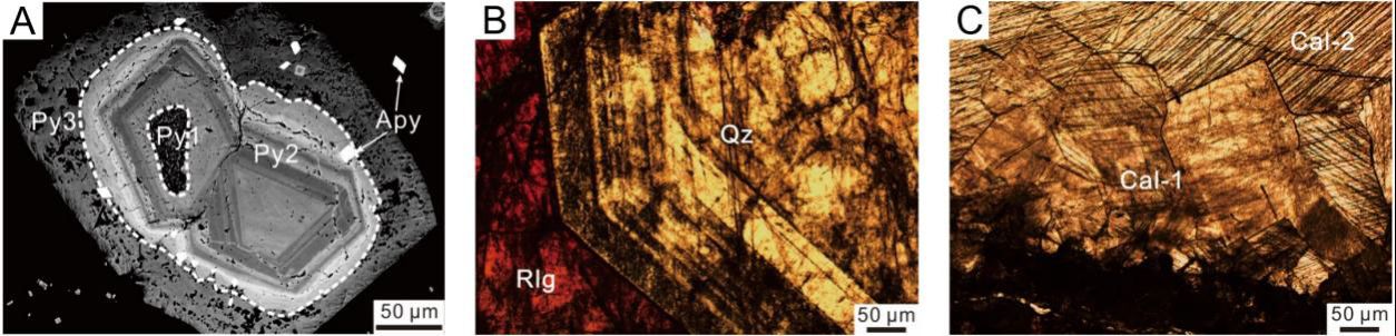 图2. A.具环带结构载金砷黄铁矿;B.与雄黄共生具环带状增结构石英;C.沿裂隙充填多期增生方解石