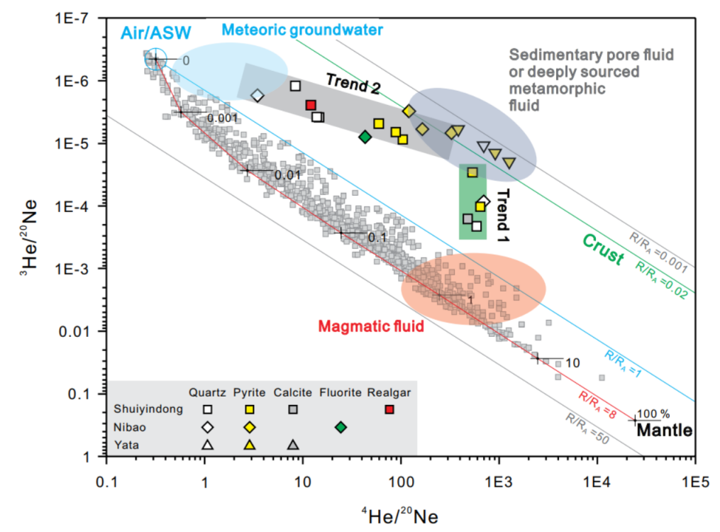Jin, X.Y., Hofstra, H.A., Hunt, G.A., Liu, J.Z., Yang, W., and Li, J.W*., 2020. Noble gases fingerprint the source and evolution of ore-forming fluids of Carlin-type gold deposits in the Golden Triangle, South China:Economic Geology, v. 115, p. 455-469. //doi.org/10.5382/econgeo.4703