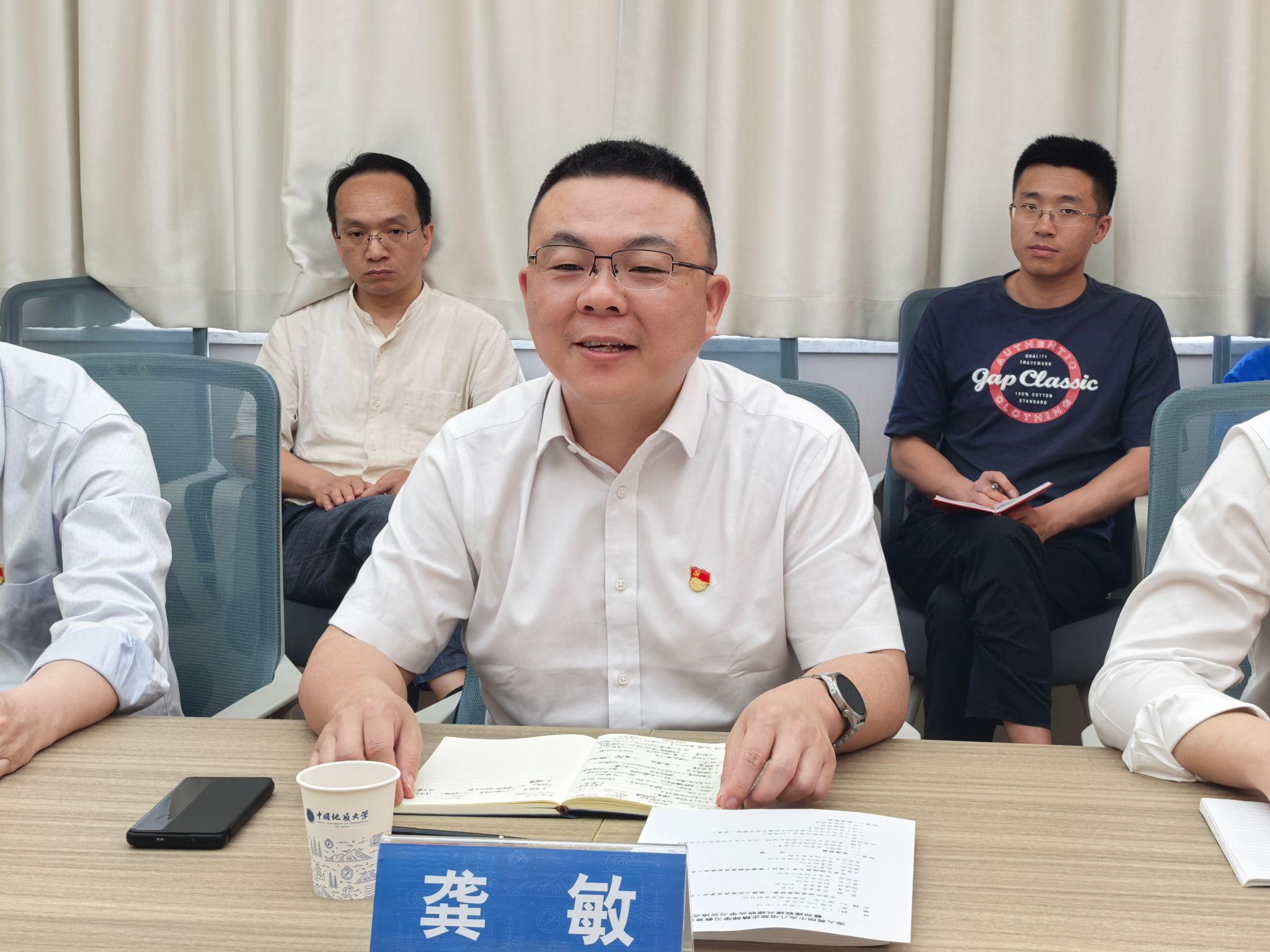 江西省地质局第一地质大队王长青、周建廷、曾广华、李国猛以及资源科学与工程系主任孙华山、系党支部书记付乐兵、系副主任靳晓野、教师代表李艳军分别发言。双方围绕深入贯彻中央八项规定精神学习教育、党建联建共建、科技创新合作发展、专业人才联合培养等方面分享经验、交流想法。大家表示,将认真学习中央八项规定精神、全面加强作风建设,持续深化校企党建联建共建、合力打造合作典范,努力推动高质量发展、开创校企共赢新局面。