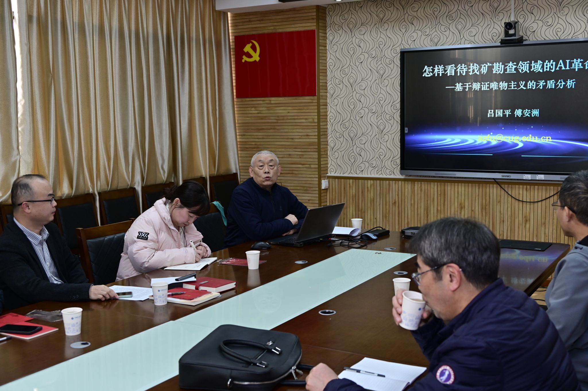傅安洲教授以“怎样看待找矿勘查领域的AI革命——基于辩证唯物主义的矛盾分析”为题讲授专题党课。他指出,找矿勘查的本质是一个不断发现、分析和解决矛盾的辩证认识过程,AI技术以新形式放大、转化和重塑了找矿勘查领域的传统矛盾。他提出,应将人工智能等现代技术深度融入课程教材,构建“地质+AI”复合知识结构;坚持课堂教学与高水平野外实践并重,推动科研反哺教学,培养学生理论联系实际的系统工程能力;同时注重地学哲学思维培养,引导学生运用辩证唯物主义方法论,借助AI技术提升科学决策与创新能力。