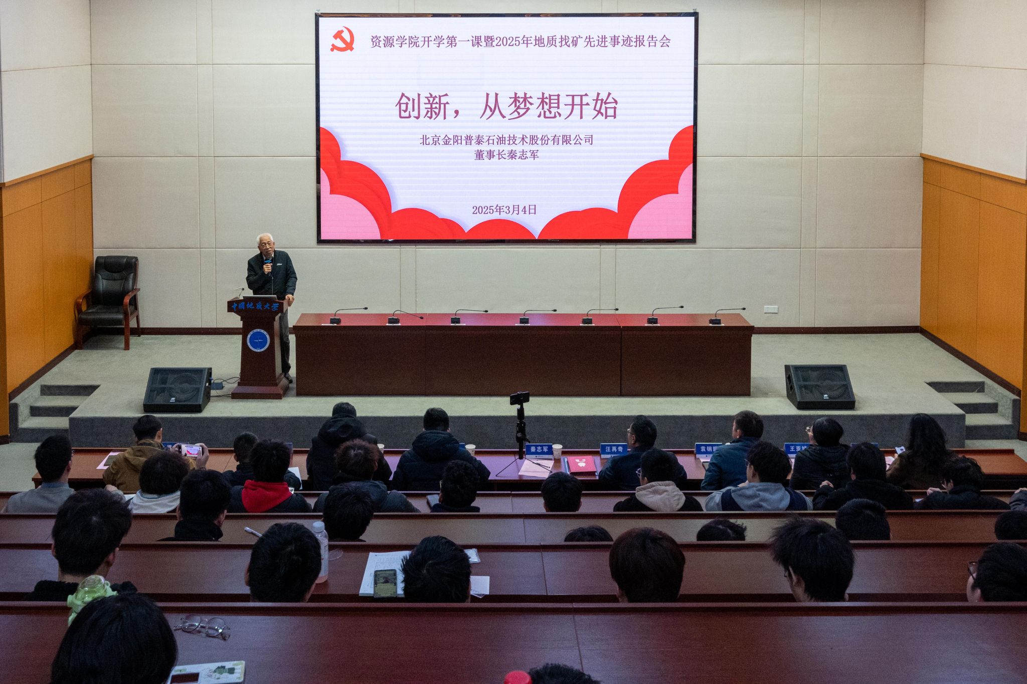 举办了开学第一课暨2025年地质找矿先进事迹报告会。北京金阳普泰石油技术股份有限公司董事长秦志军、总经理袁钢辉,公司武汉代表胡甫强、王亚婧,党委学生工作部部长朱丹,日本av在线看