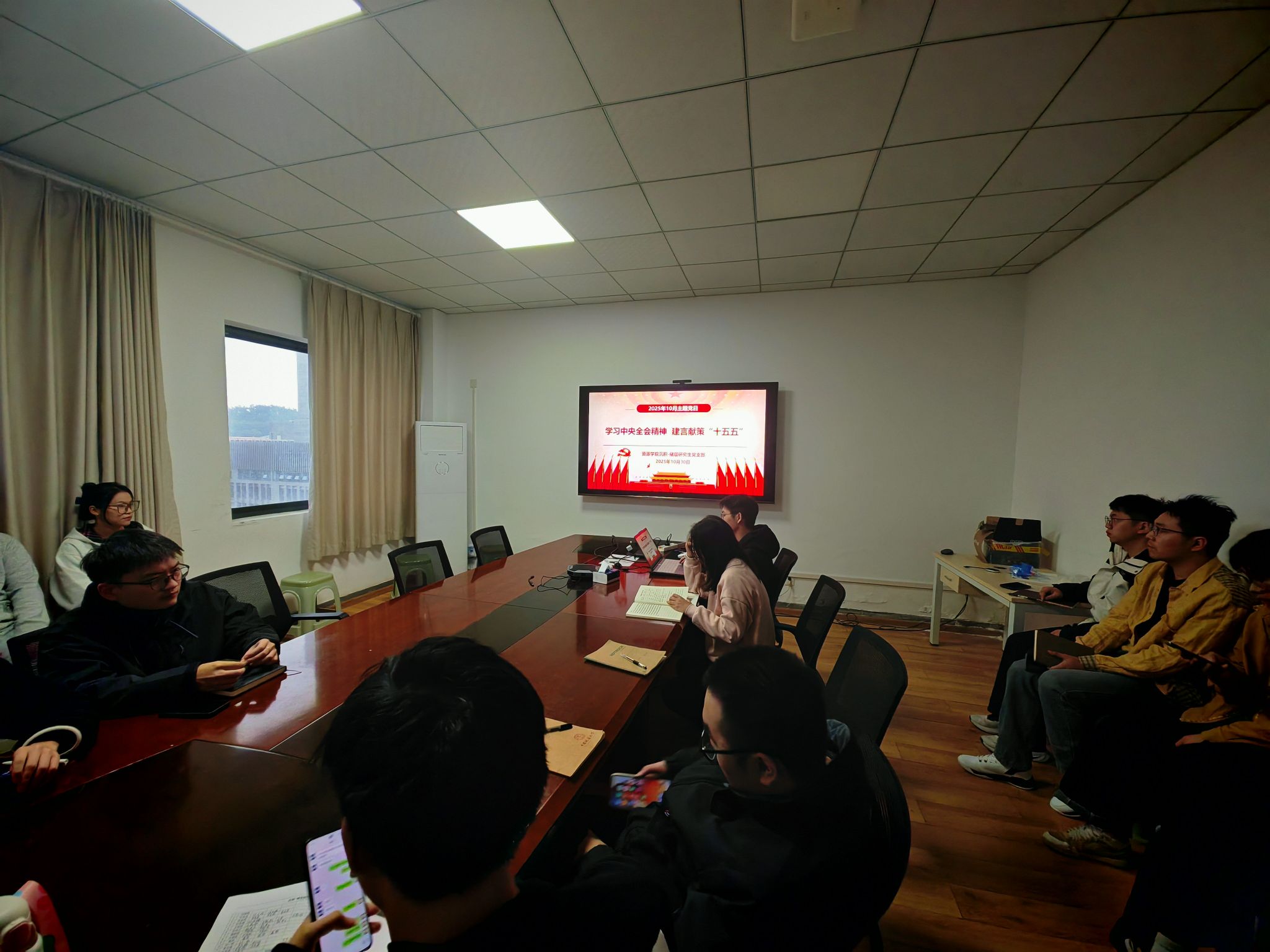 沉积-储层研究生党支部在老珠宝楼801会议室举行十月主题党日活动。活动以“学习中央全会精神,建言献策‘十五五’”为主题,结合学院“红星引领计划”,深入开展政治理论学习与党员履职交流。支部全体党员和部分入党积极分子参加。