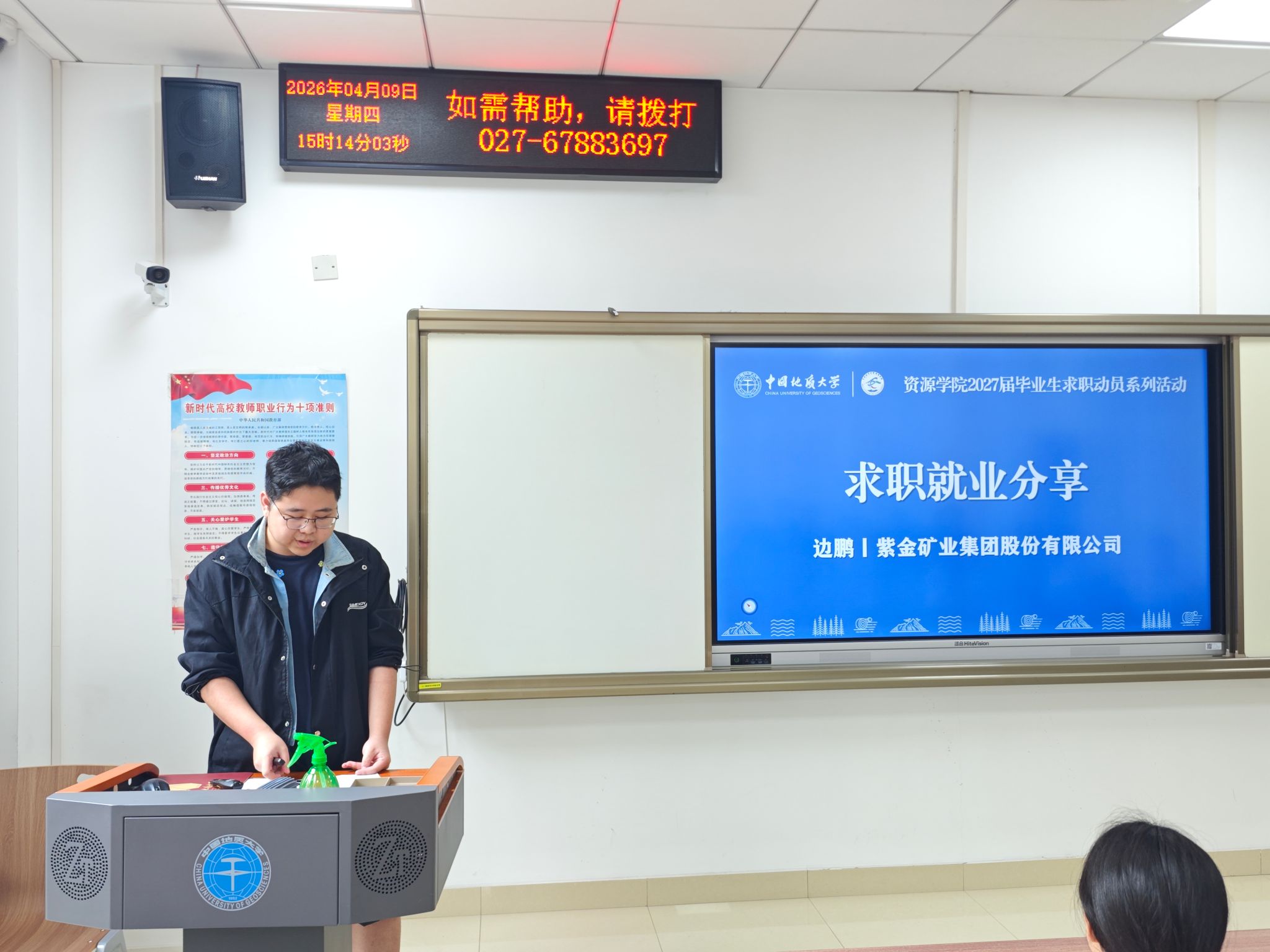 2022级本科生、签约紫金矿业集团股份有限公司的边鹏,分享了“先定方向、再选地点”的职业规划思路。他建议同学们先明确自己适合技术研发、生产管理还是市场拓展等赛道,再根据行业或区域集聚地选择工作城市。他还特别提醒关注企业秋招“黄金窗口期”(每年9-10月),尽早投递。
