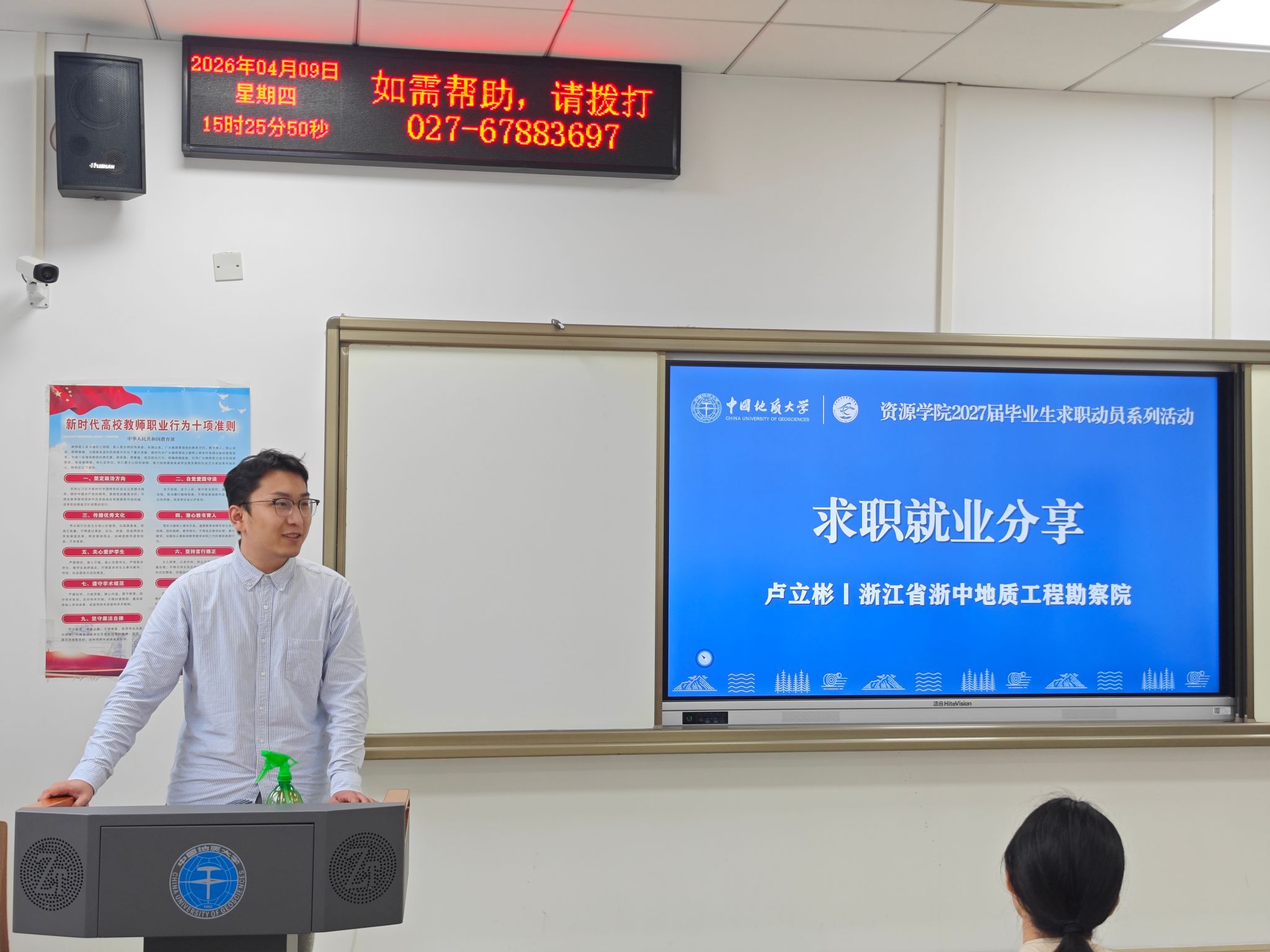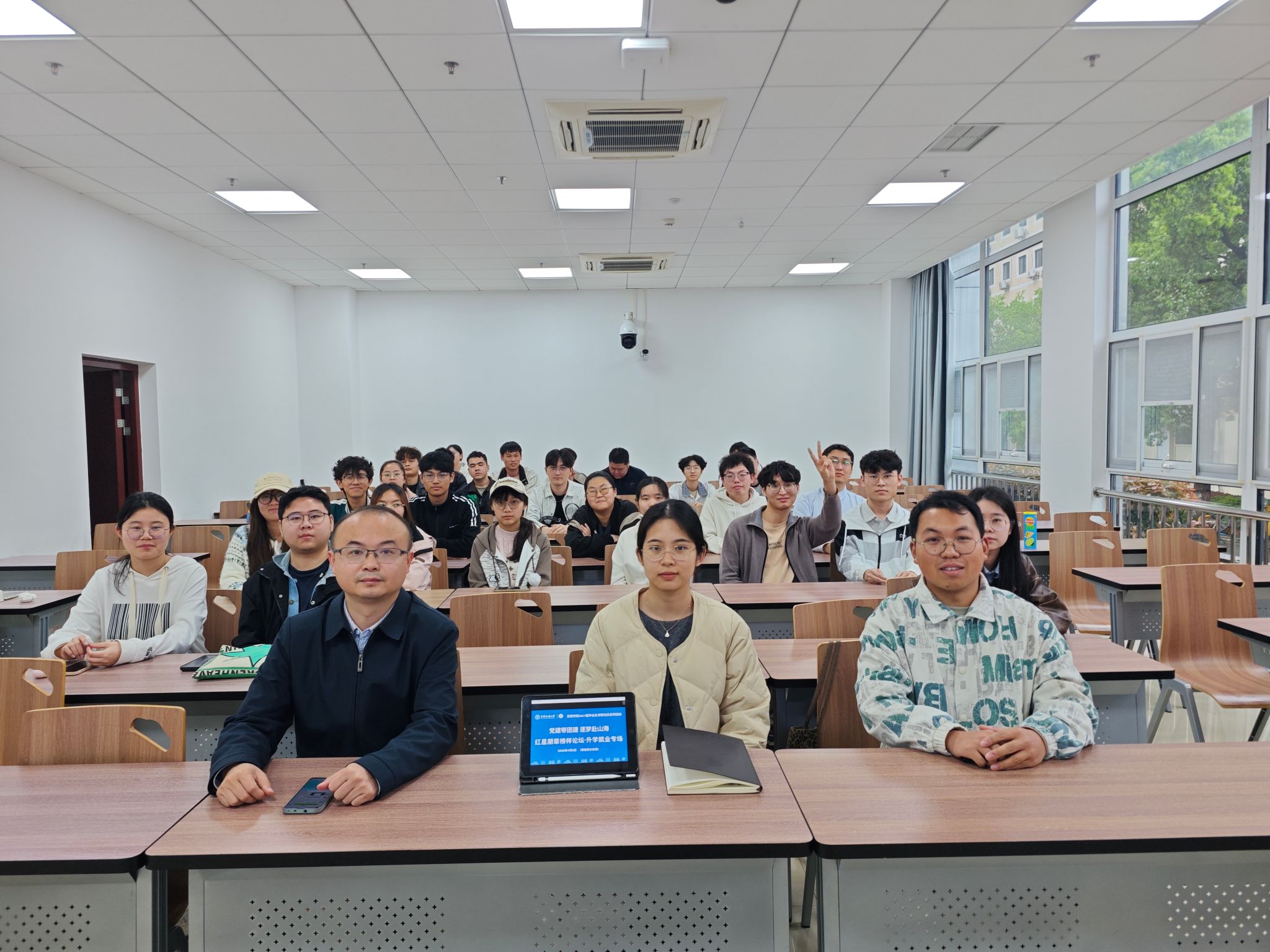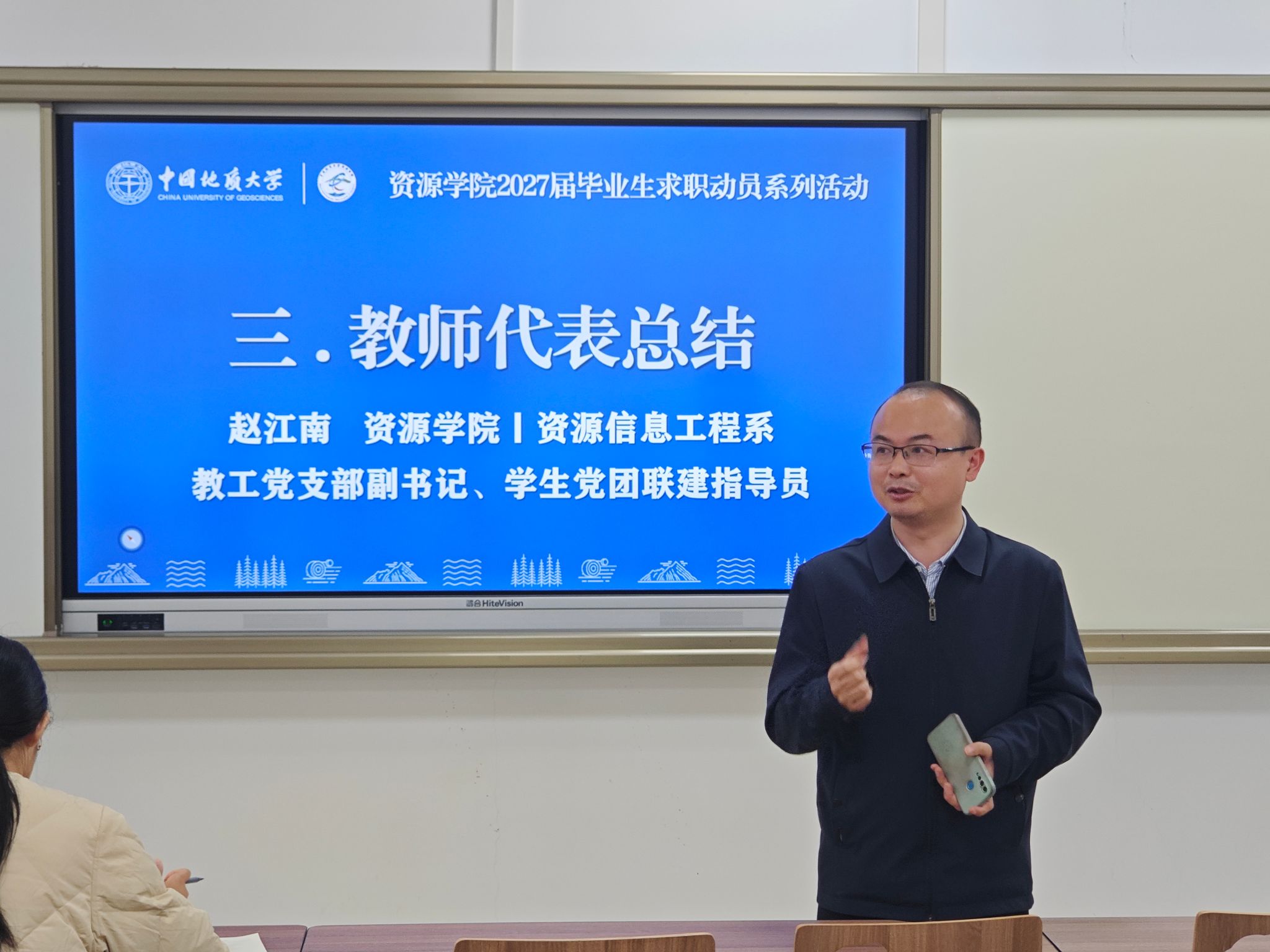 资源信息工程系在东教综合楼B110举办红星朋辈榜样论坛·升学就业专题活动。资源信息工程系教工党支部副书记、学生党团联建指导员赵江南,辅导员刘睿,分享代表钟莉、徐焕超、边鹏、卢立彬、刚承儒、唐景杰、王悦颖,以及2023级资源环境大数据专业全体学生参会。会议由地学大数据第一党支部书记马俊主持。