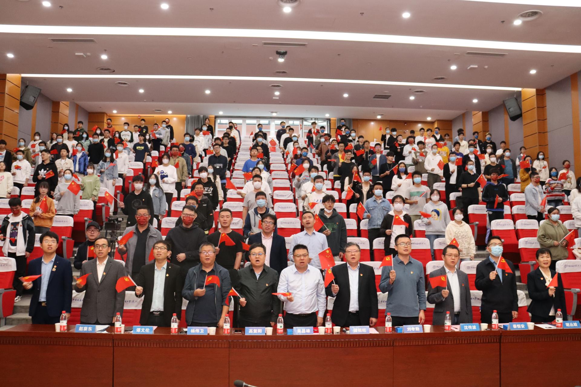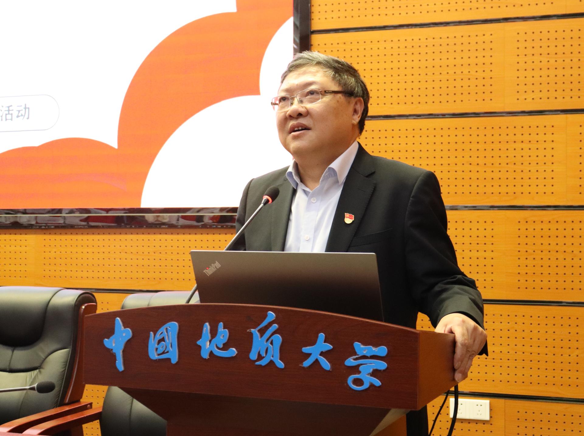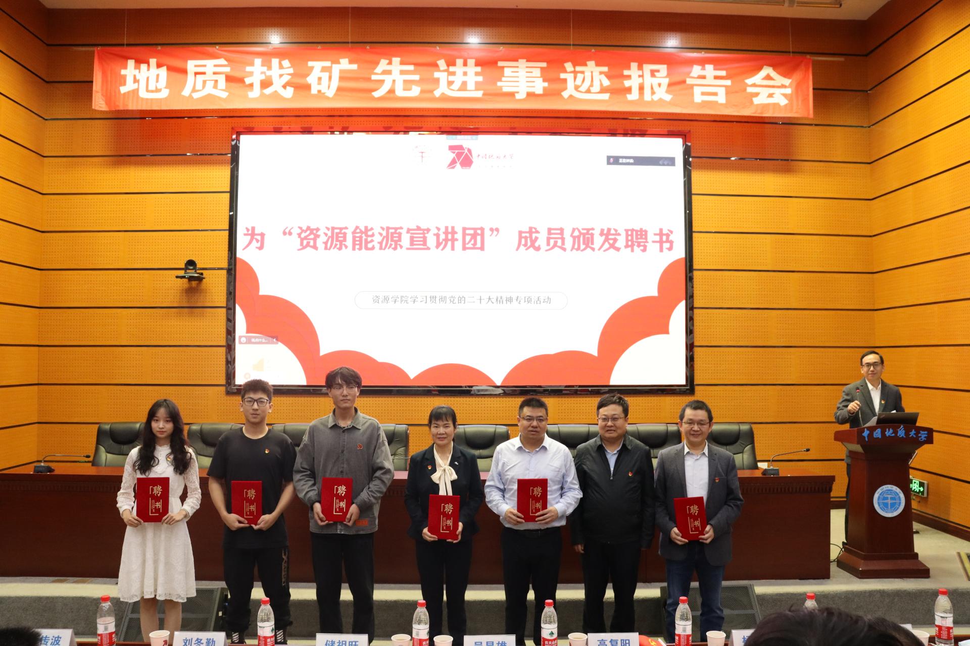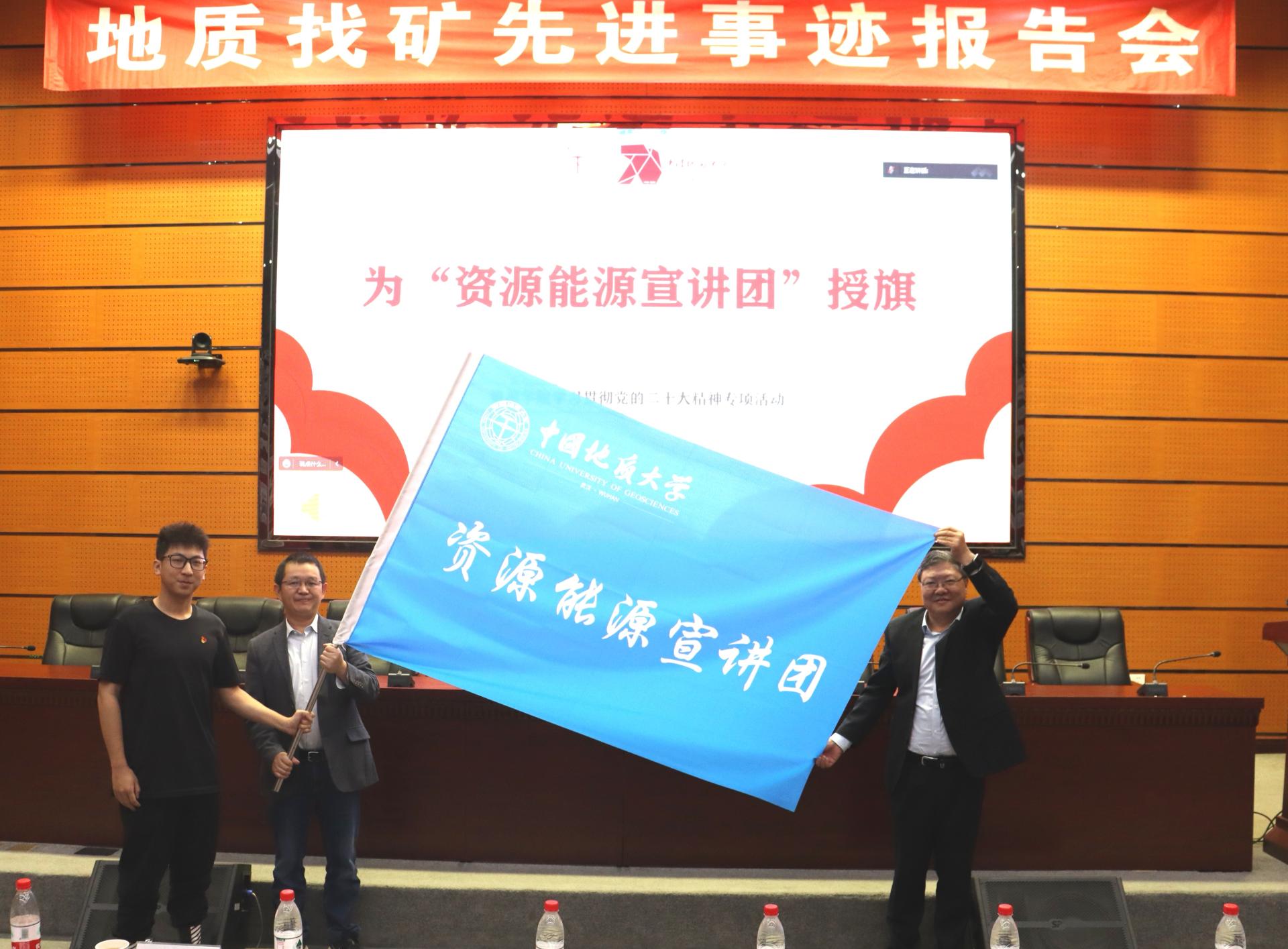 “资源能源宣讲团”授旗。武汉市委宣讲团成员、副院长沈传波教授,“志留纪”科普平台负责人、资源勘查工程专业2020级本科生吕骏腾代表接旗。