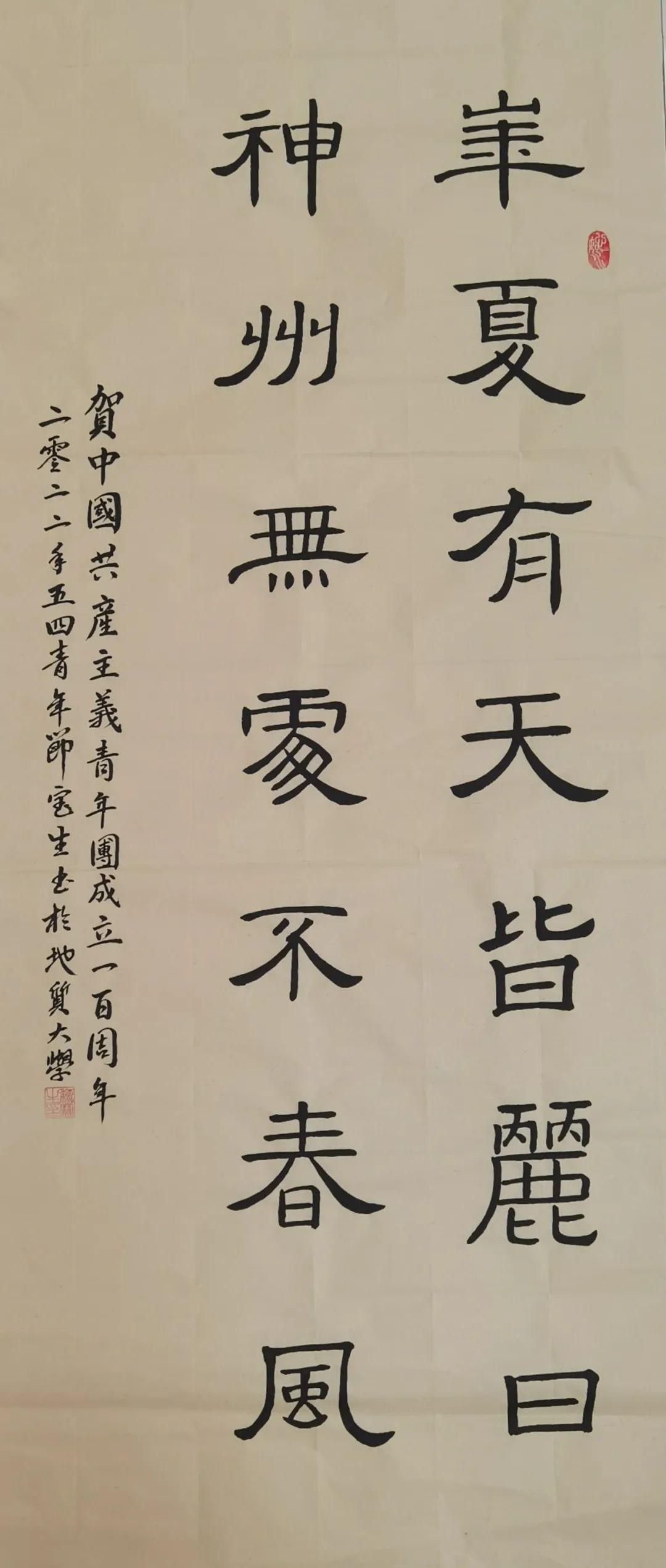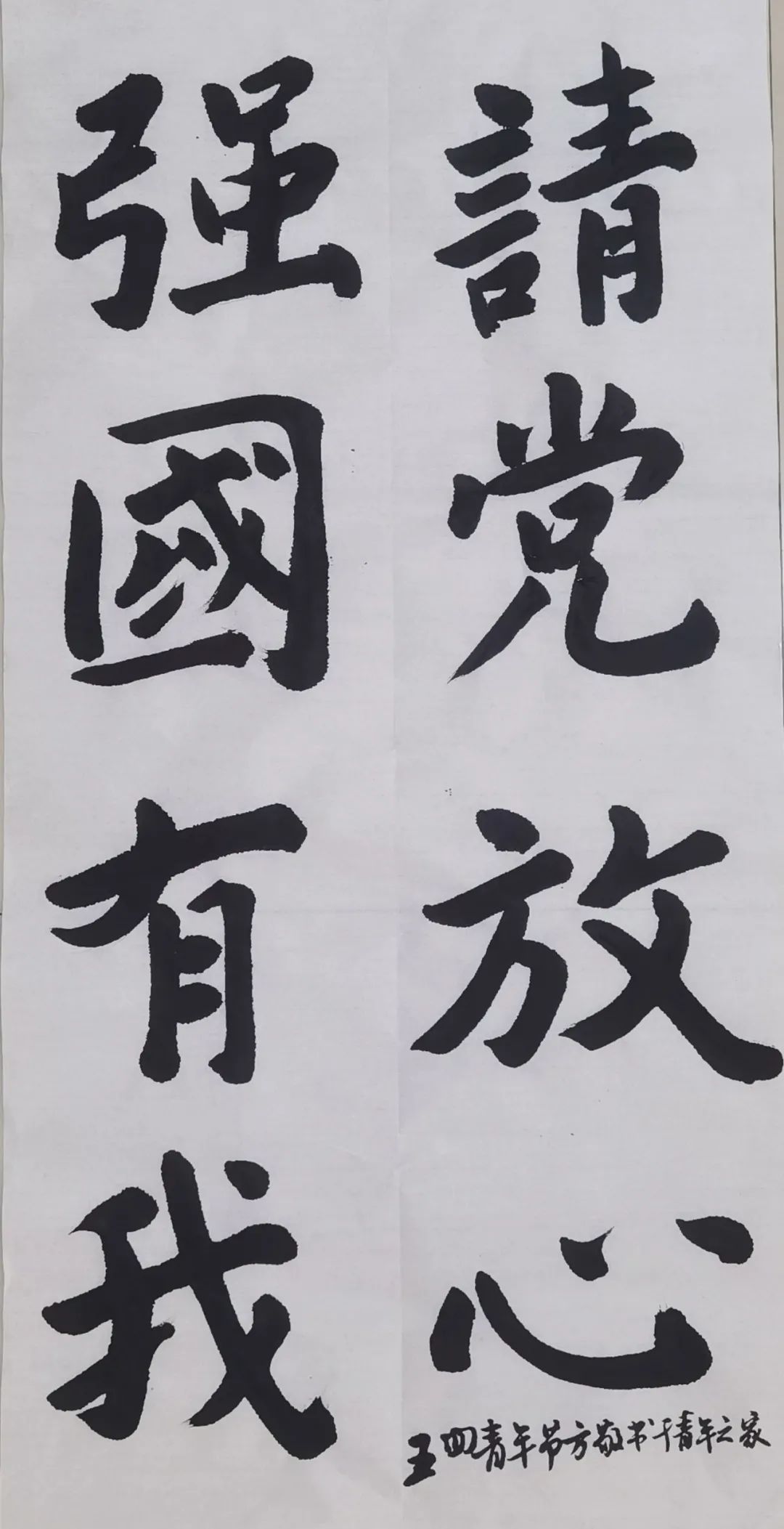正值五四青年节之际,泼墨挥毫,挥翰临池,书写对祖国和团的美好祝愿,对未来的期盼。每个人都写出了属于青年人独有的豪迈与冲劲。“在青春的赛道上奋力奔跑,争取跑出你们这一代人的最好成绩!”习总书记在中国人民大学考察时说到。作为一名资源er,我们也应在青春的赛道上奋力奔跑,努力学好专业知识,为国家资源能源事业贡献自己的一份力量。