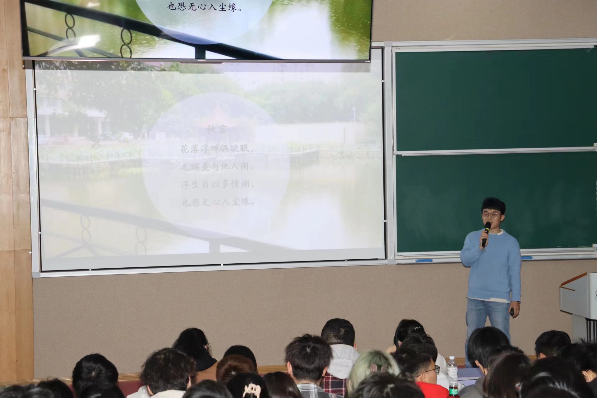 聂思嘉以“ 不负韶华,且行且诗:我的蜕变之路”为主题,从个人履历,大学生活总论,专业学习,学生工作,实践锻炼,课外拓展等六个方面讲述了丰富多彩的大学生活。在轻松愉快的氛围中讲述了自己从一名挂科学生到以优异成绩保研的蜕变之路。