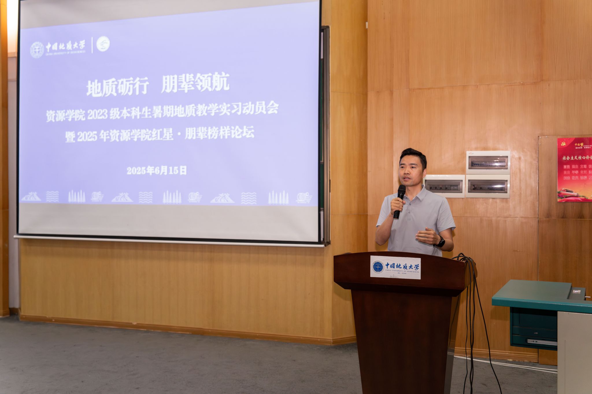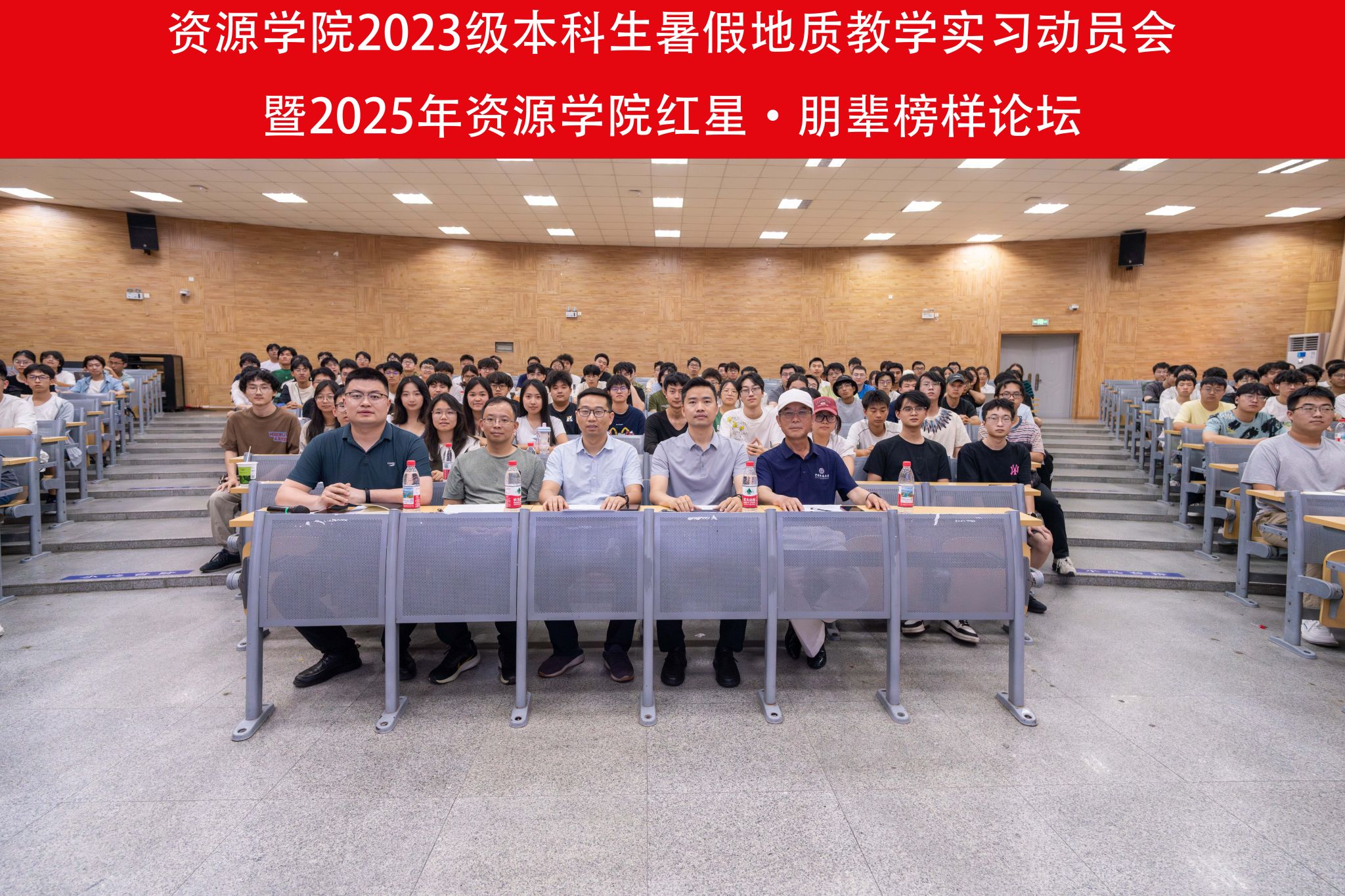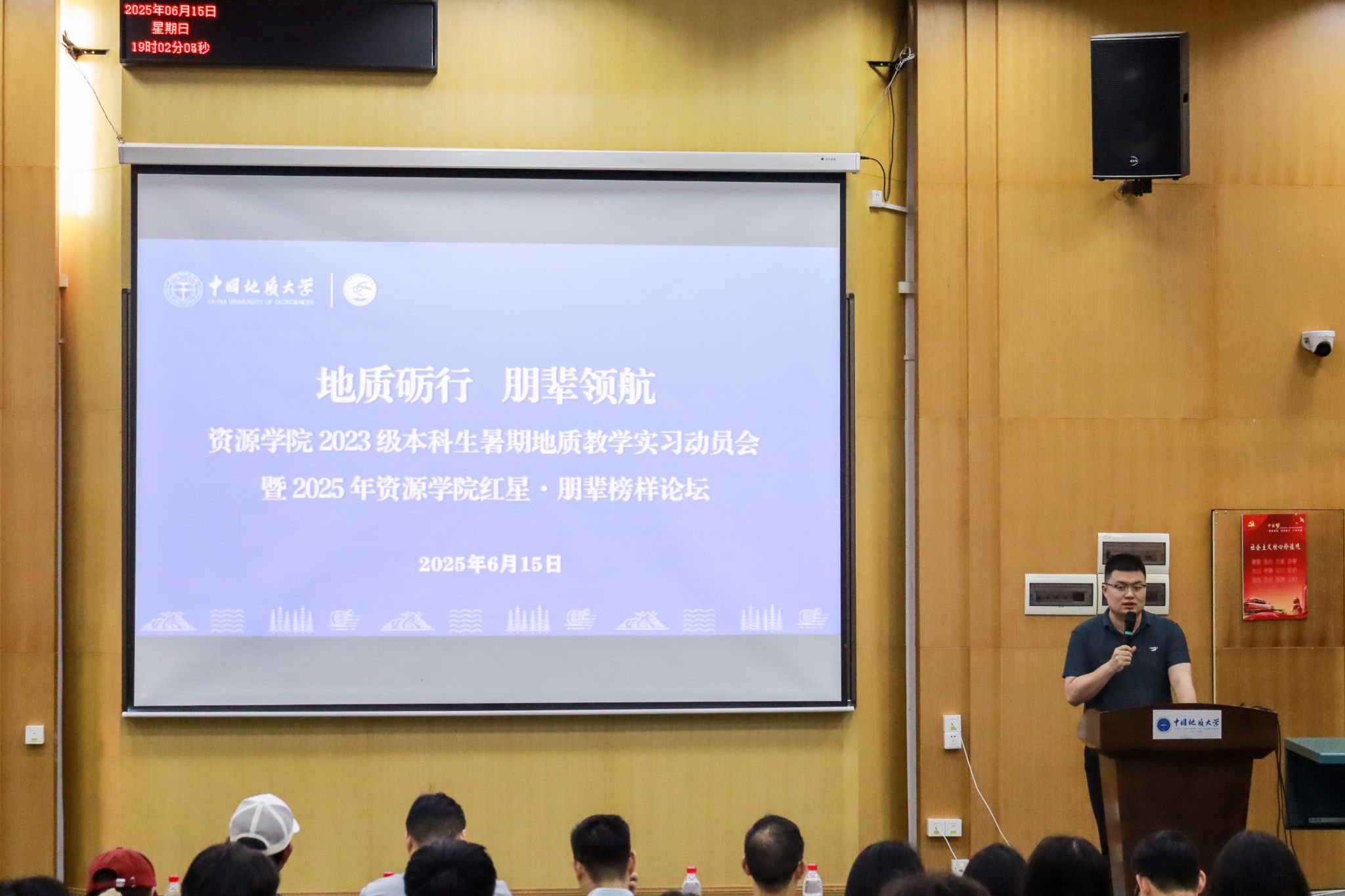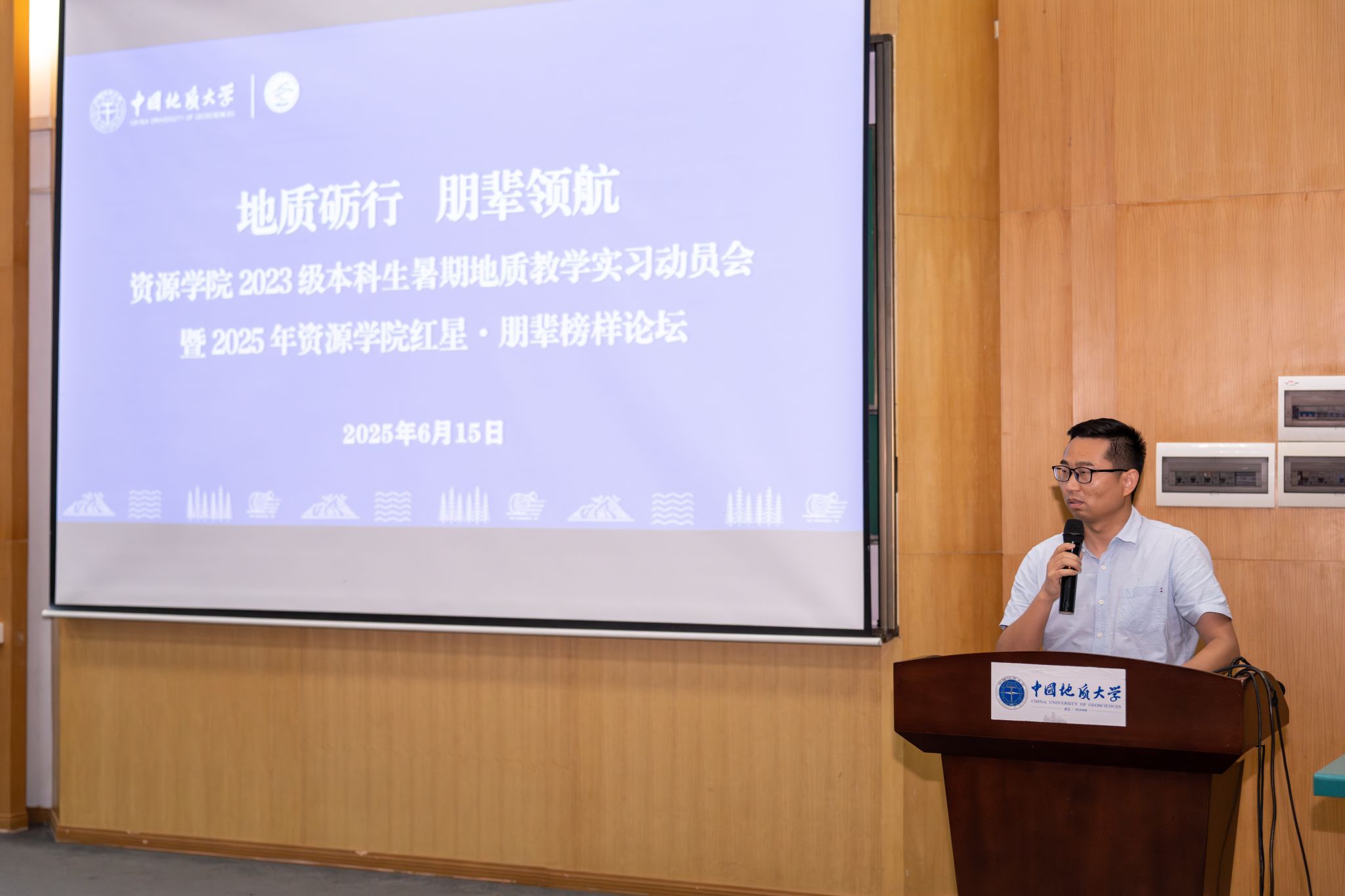 2023级本科生暑期地质教学实习动员会暨2025年红星·朋辈榜样论坛在教三楼109举行,学院党委副书记谭文伦,副院长李占轲,周口店实习站队长魏启荣,秭归实习站队长李嘉光,辅导员彭鑫,2024届本科毕业生马玮、刘欣、刘子萍,2025届学生会执行主席余慧和2023级全体本科生参加会议。会议由辅导员彭鑫主持。