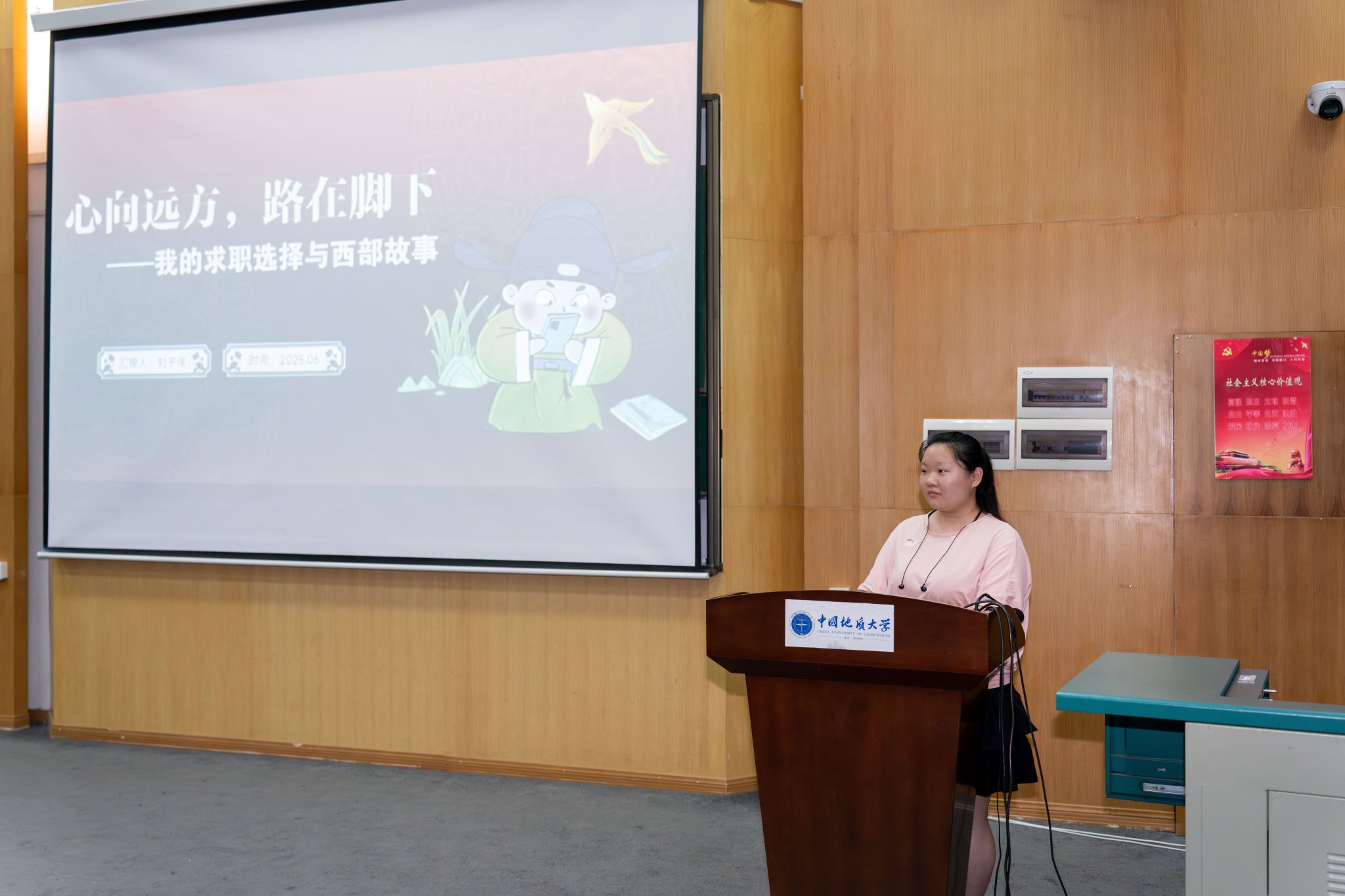 即将奔赴新疆生产建设兵团服务、学校2025年西部计划志愿者刘子萍以《心向远方,路在脚下——我的求职选择与西部故事》为题分享备考西部计划经验。她结合自身学习与求职经历,讲述了西部计划的相关政策、选拔流程和备考经验,让同学们对西部计划有了更清晰的认识。