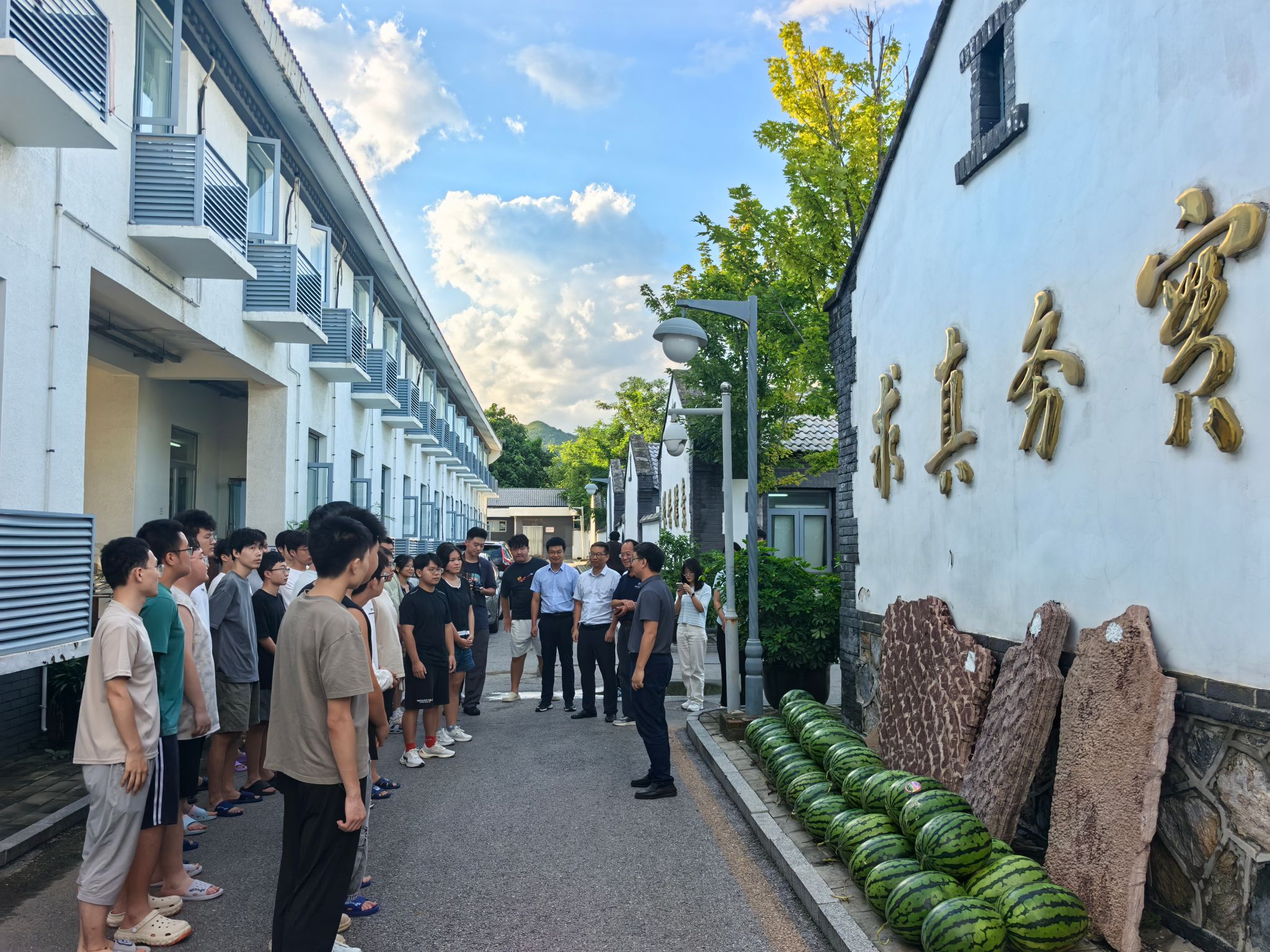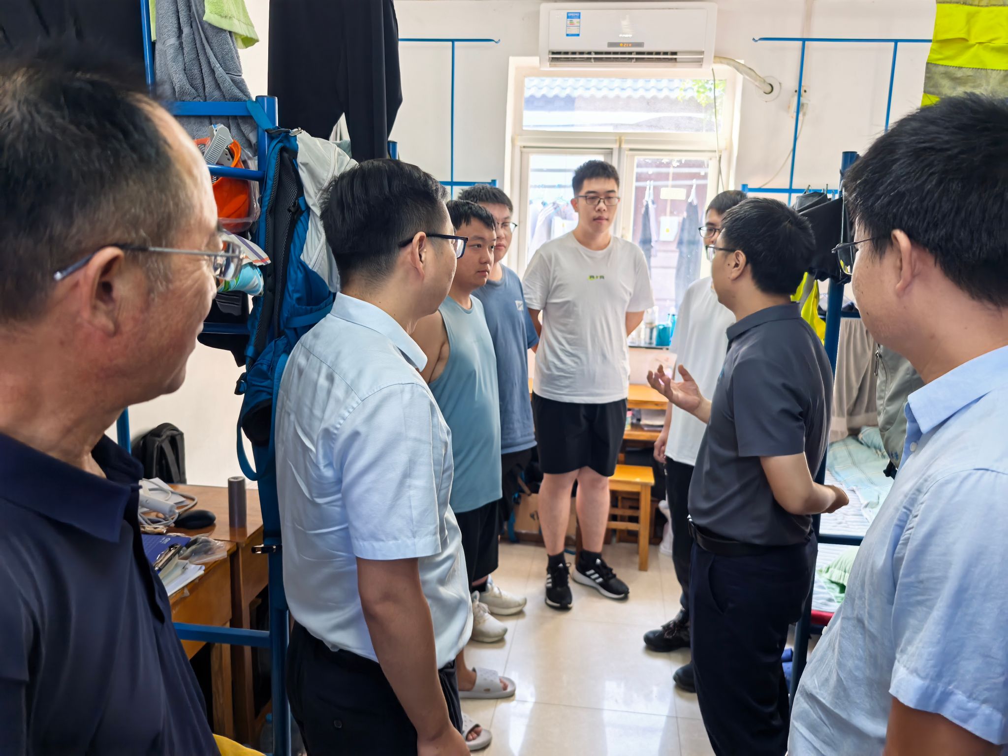 随后,汪再奇一行来到教职工宿舍看望慰问,向坚守教学一线的实习团队教师致以敬意,对教学团队在高温考验中完成备课任务、在暴雨影响下保障学生安全、高效有序推进教学任务表示肯定和感谢。他强调,野外实习是地质人才培养的关键环节,要继续秉持高度的责任感和使命感,始终将师生安全放在首位,抓好教学组织与安全保障的每一个细节,将周口店“地质摇篮”的优良传统发扬光大,让这段实习经历成为师生共同珍藏的“摇篮”记忆。