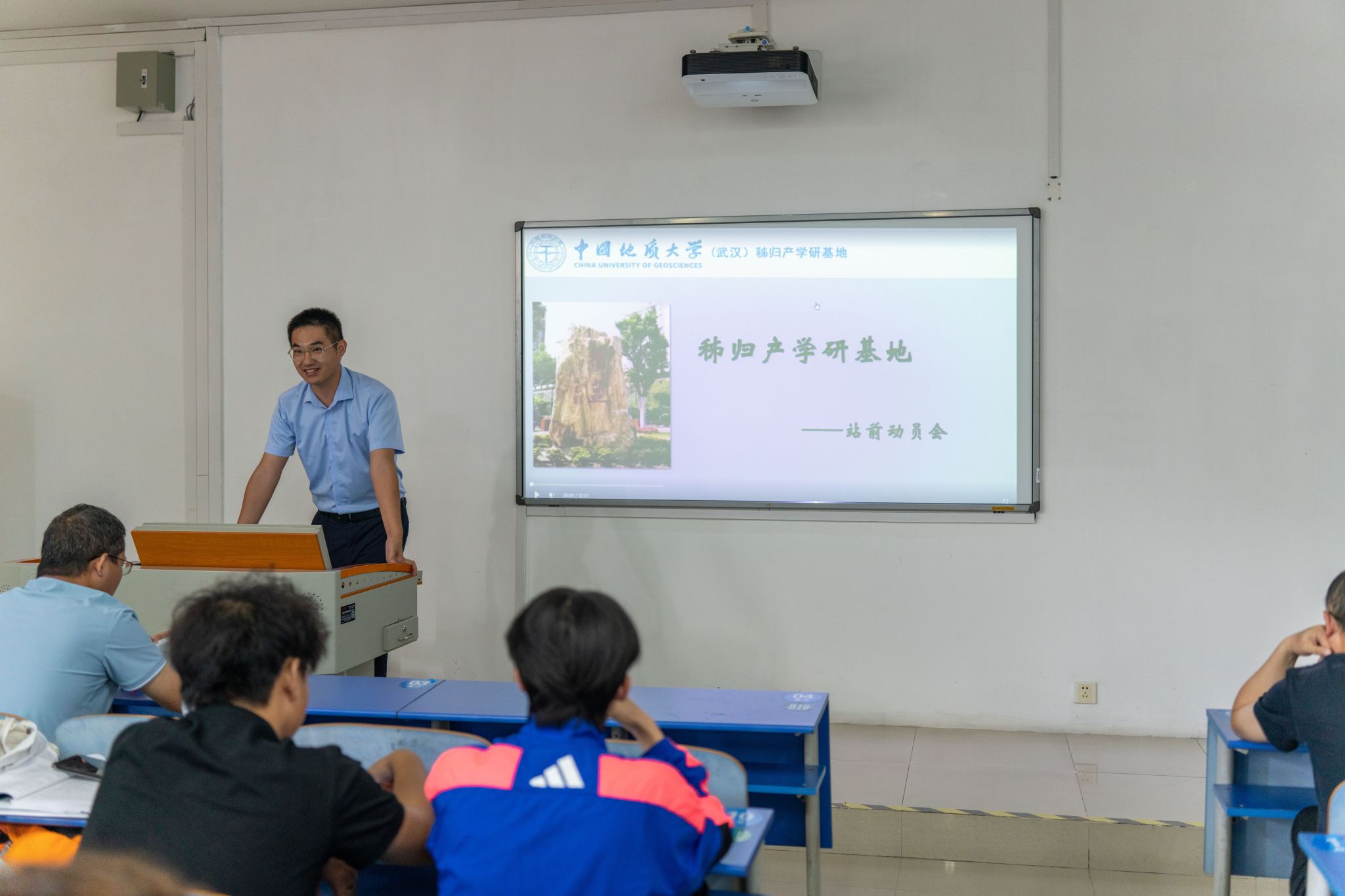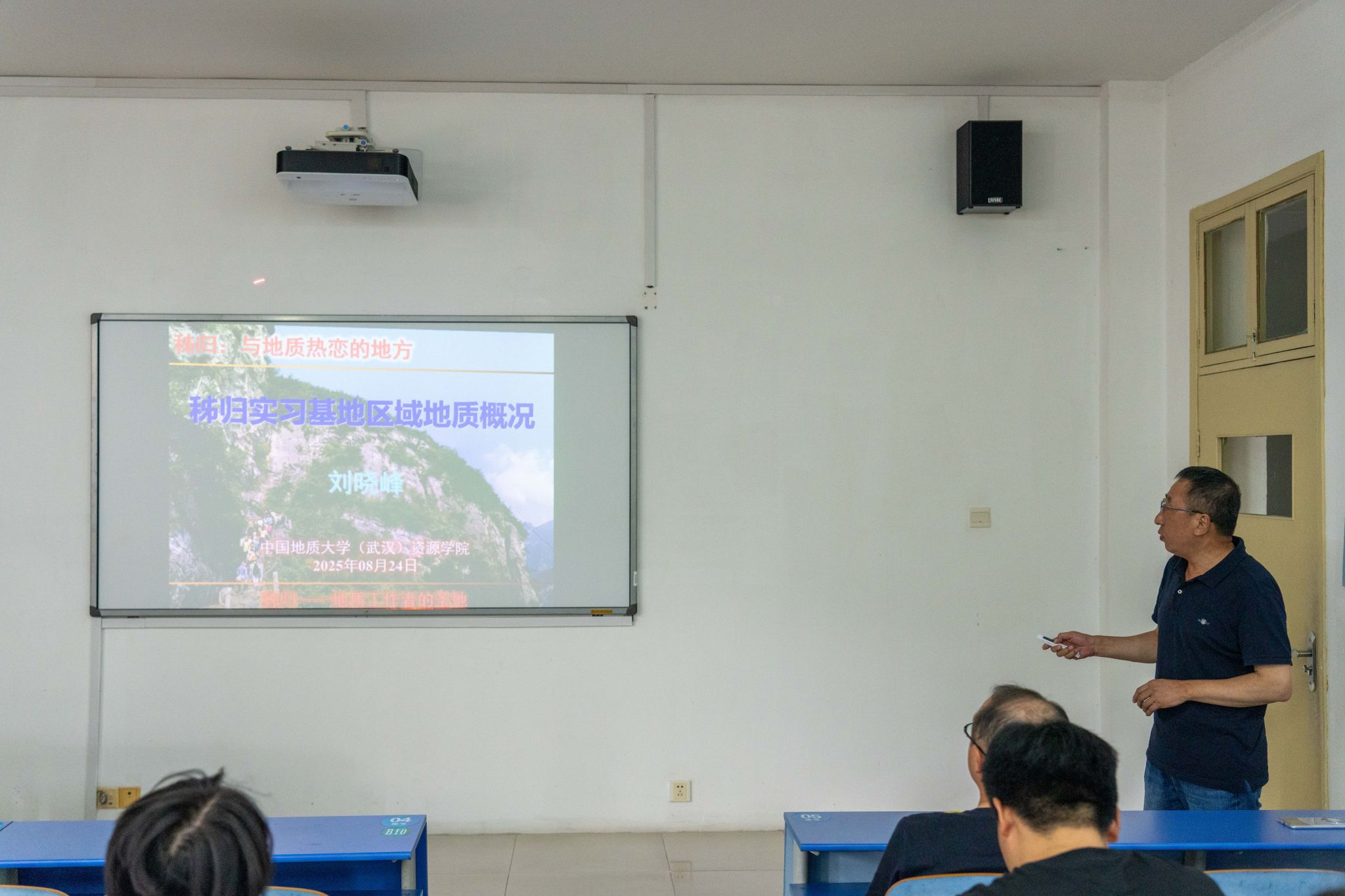 刘晓峰做《秭归实习基地区域地质概况》专题报告,介绍了秭归区域的地构造位置,揭示了扬子板块的变迁历史及各时期地层岩石组合、地层层序和接触关系概况。