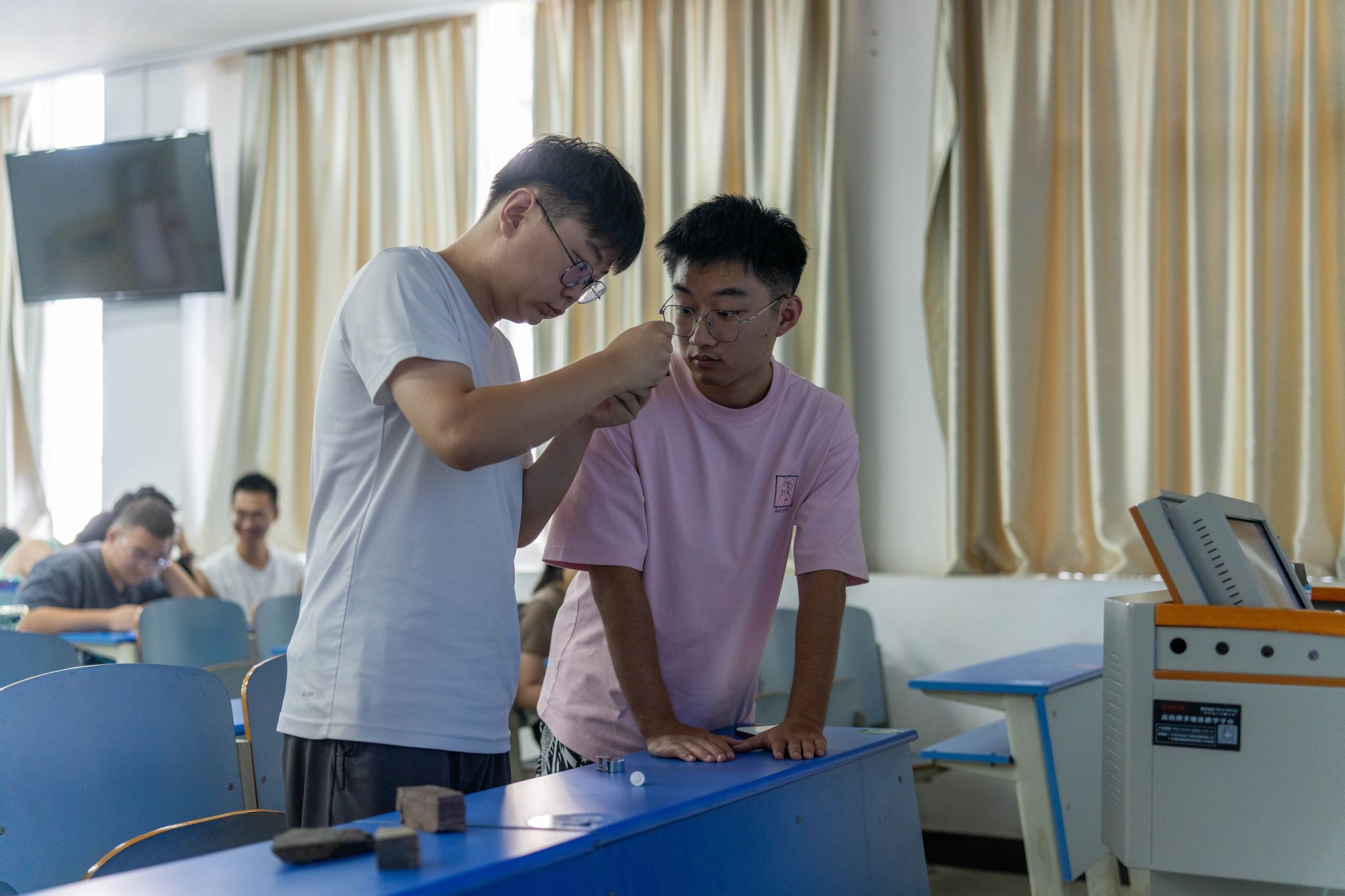 课程讲解结束后,同学们观察、描述岩石标本,熟练罗盘使用方法,在实践操作中增强地质实习基本功。