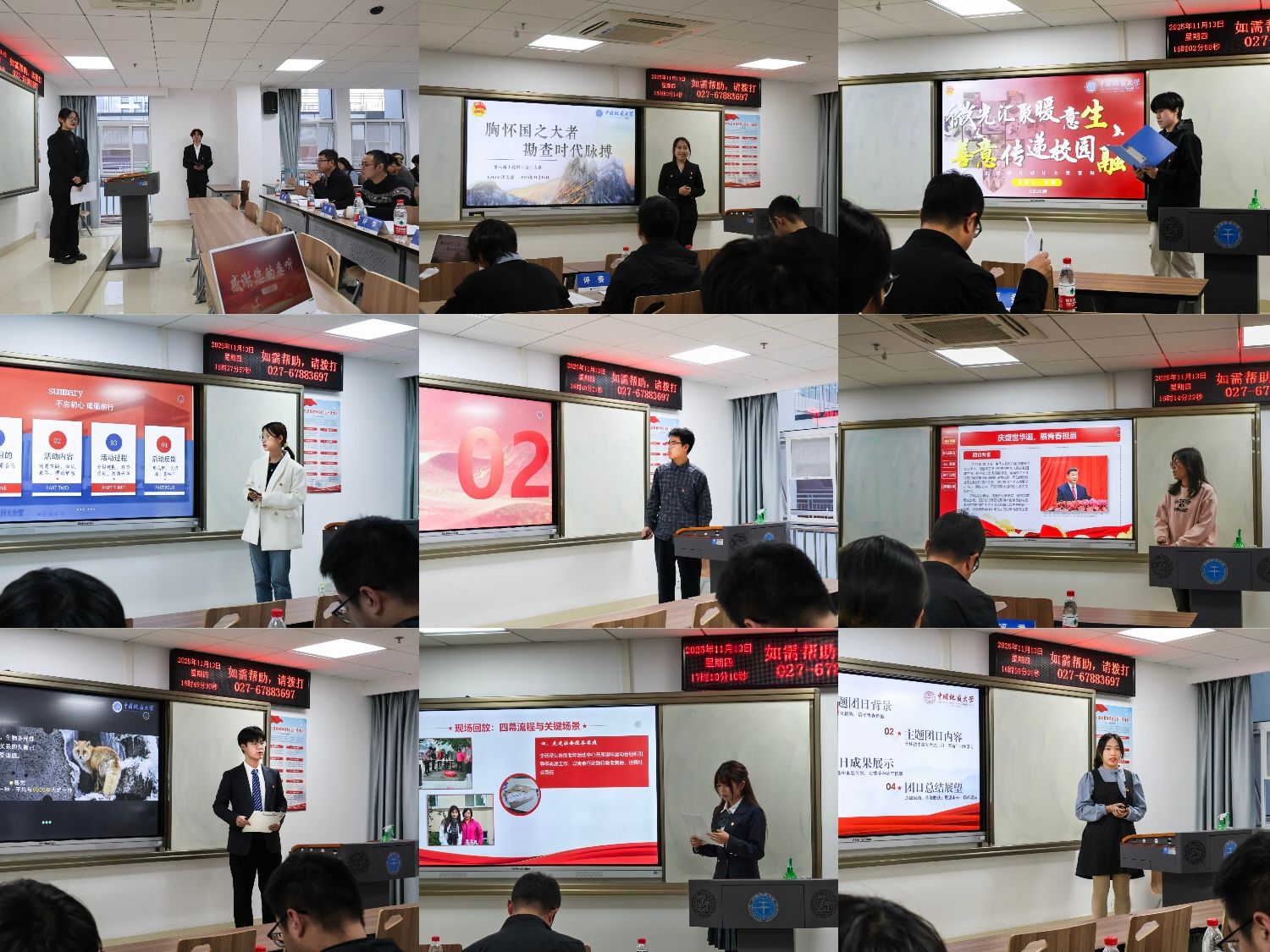 在主题风采展示环节,各参赛团支部通过主题团日设计环节中的模拟联合国大会、主题领读、专题领学、手工制作、户外实践、线下参观以及主题剧本杀展示了十月份主题团会的开展情况。