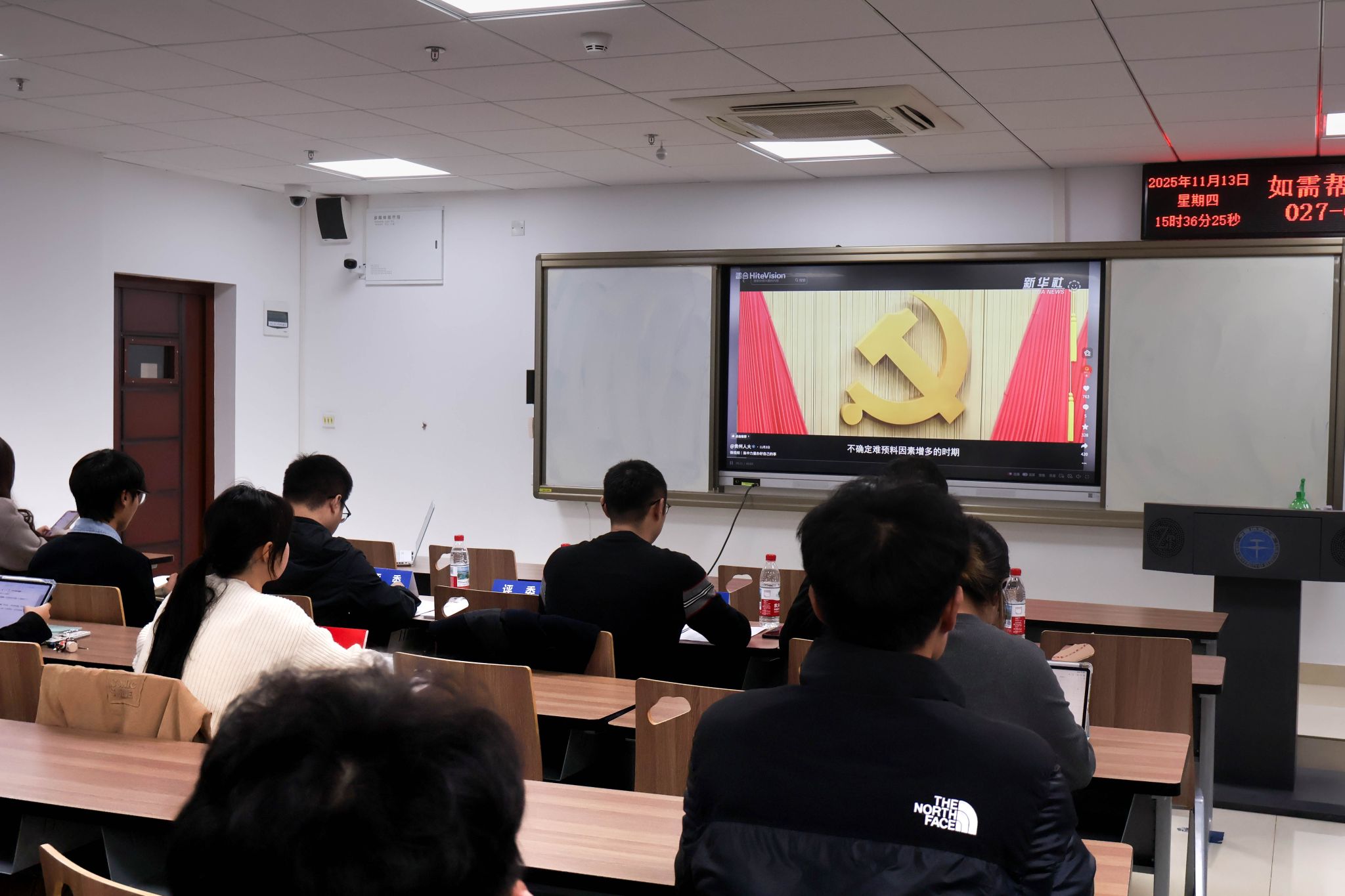 在主题学习环节,与会师生共同学习了《中共中央关于制定国民经济和社会发展第十五个五年规划的建议》。