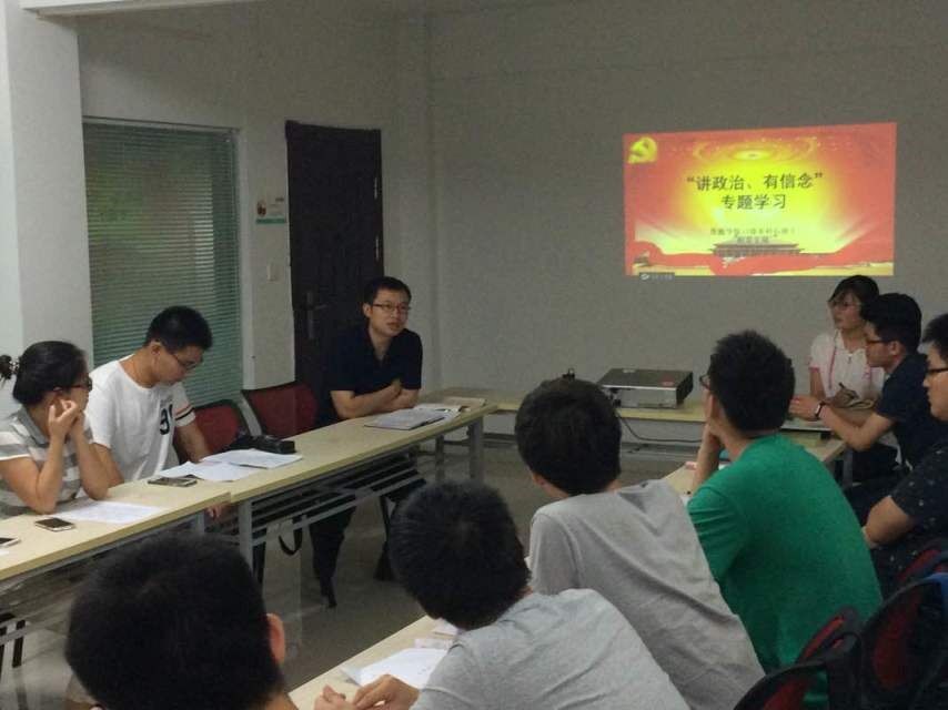 王君如同志首先对“两学一做”学习教育从总体要求、学习教育内容和问题思考三个方面进行了系统介绍。王君如强调,大学生党员“两学一做”的重点在于坚定理想信念,牢记党人民服务的根本宗旨,同时她提出“什么是合格党员,如何做当代优秀大学生党员”,引发大家的思考。徐健同志率先结合自身实际,深入分析党章,就“两学一做”发表自己的见解;紧接着李长海、韩玉波同志分享了他们在“两学一做”学习教育中的所感所想,会议气氛逐渐走向高潮。