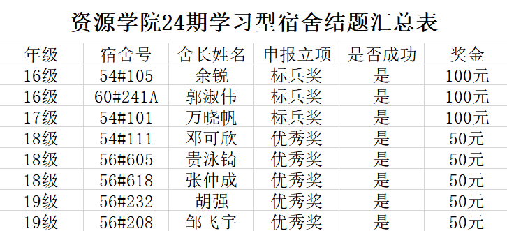 为了进一步加强寝室的优良学风建设,积极响应“学习型宿舍”创建活动。希望通过此次活动能够营造一种文明、团结、奋进的宿舍氛围,将“快乐学习、自主学习”的学习意识在宿舍发扬光大。良好的学习文化是构建“学习型宿舍”的基本要素,在此次活动中我们将致力于改善寝室学习风气,培养好的个人生活习惯,促进宿舍成员的成长与奋进,营造温馨、愉悦的寝室氛围。经审核,以下宿舍结题成功,特此公示。希望结题成功的宿舍继续保持,争取再创辉煌。也希望其他宿舍向这些宿舍学习,争取在下一期活动中结题成功。