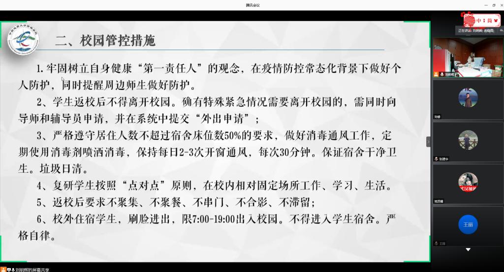 举行返校学生疫情防控教育活动,学院党委副书记张建华、全体辅导员、全体返校复研学生和2020届毕业生参加。