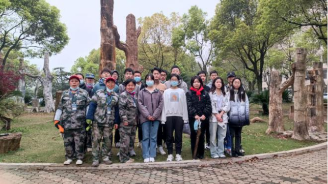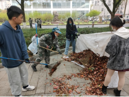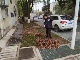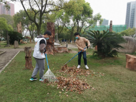 上午8点20分,志愿者们分组集合,领取清扫工具,在校园环卫工人带领下前往相应区域开展清扫活动。扫把挥动间,铺满草地的落叶们抱成了团。在阿姨们的指导下,志愿者们将树叶装上推车,并送至垃圾处理处。