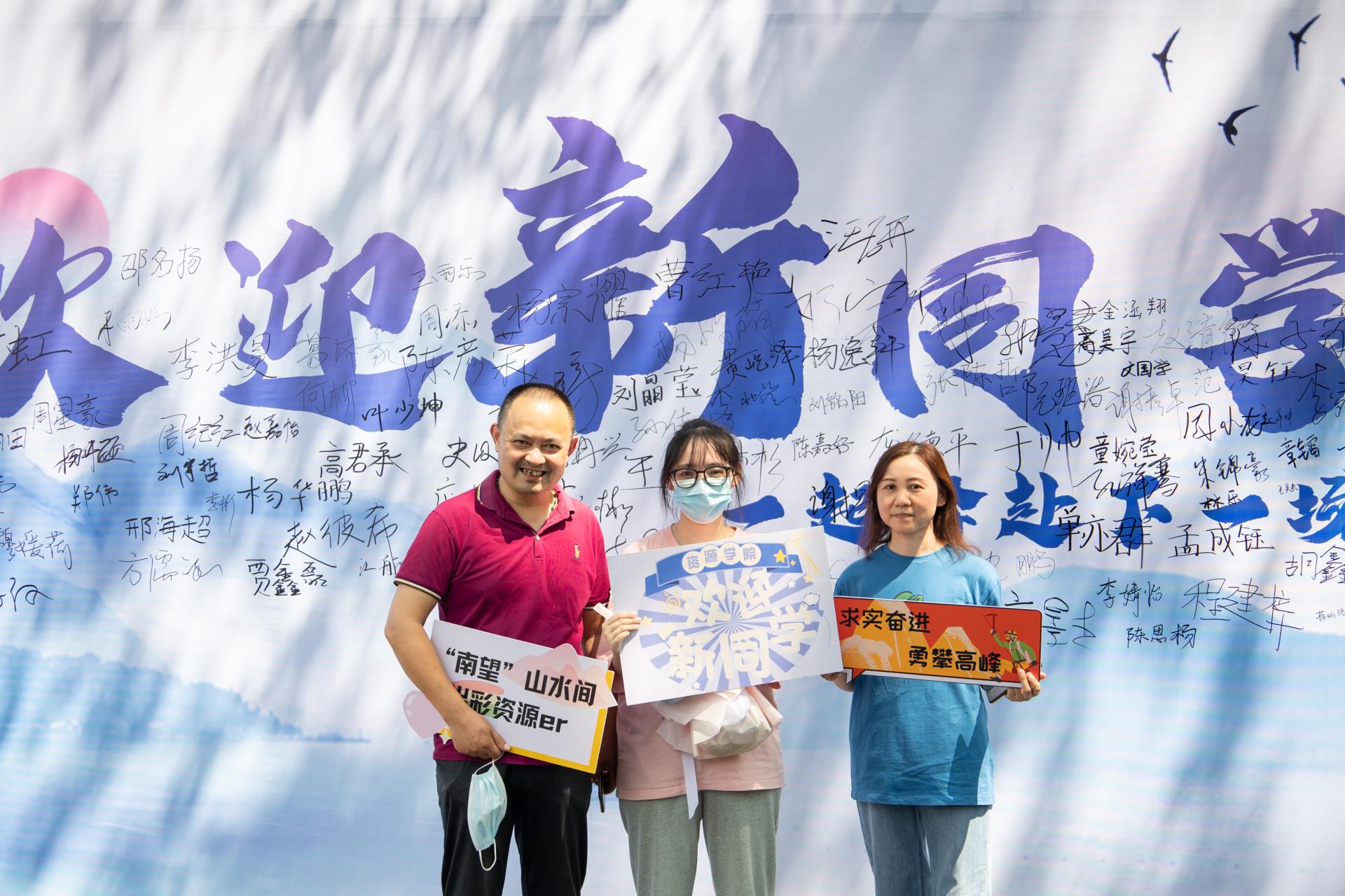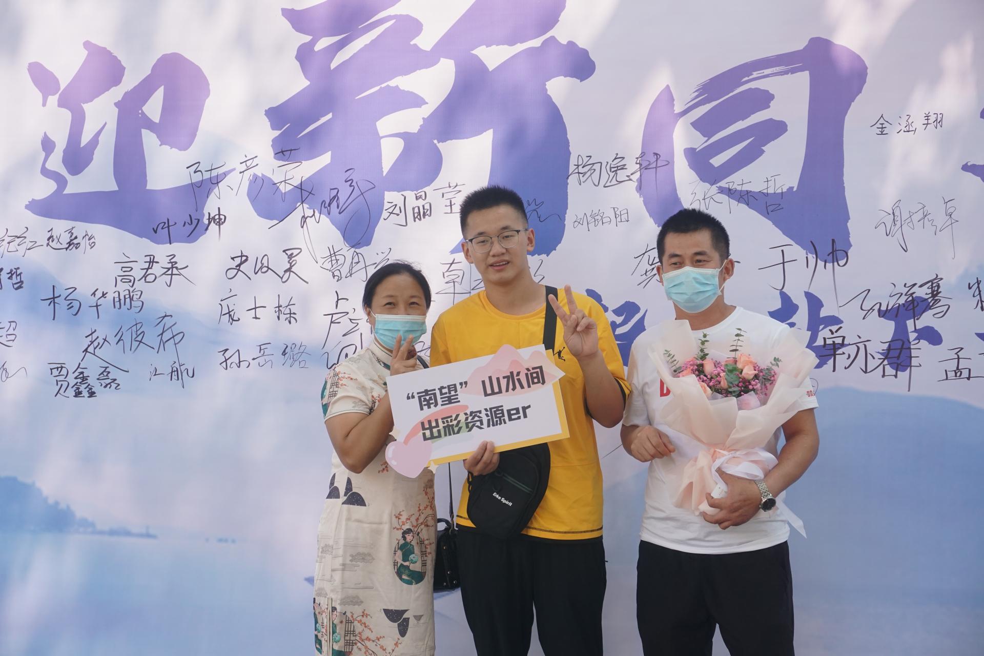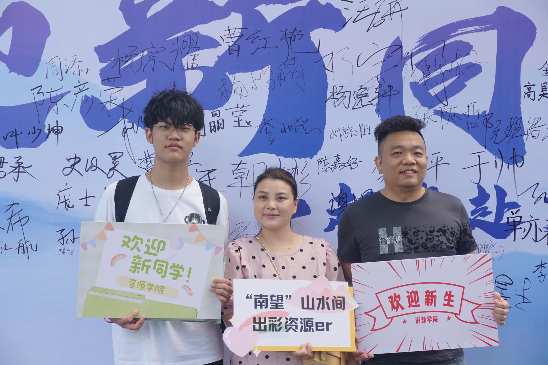 完成报道后与家人在签名墙留下了大学里的第一张合影