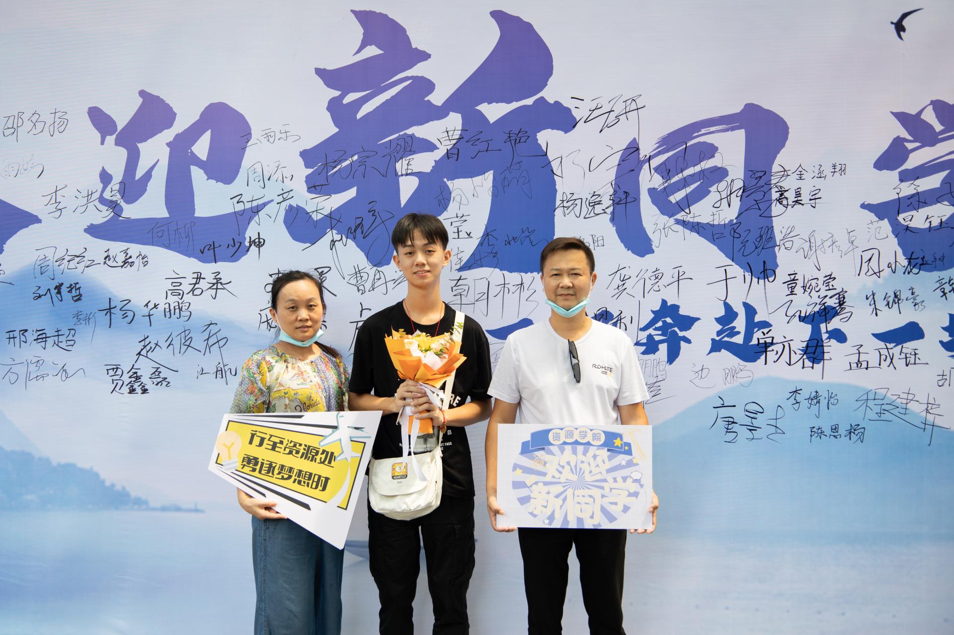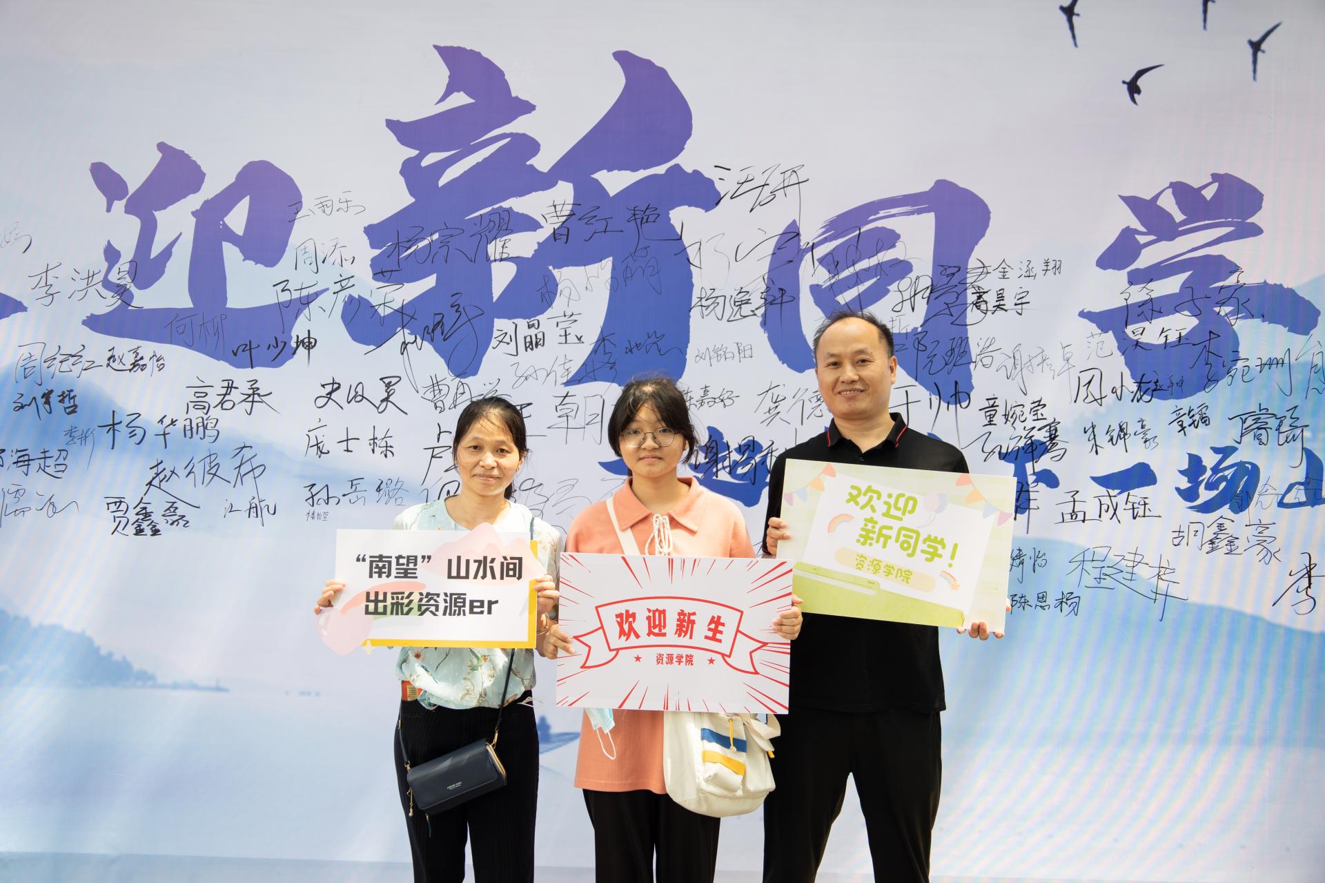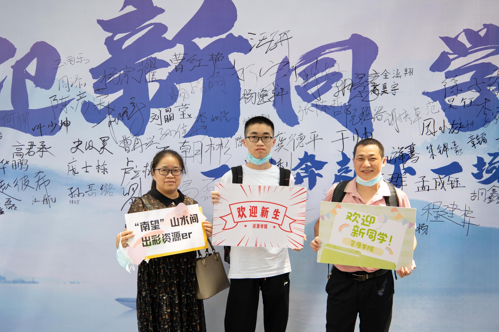 完成报道后与家人在签名墙留下了大学里的第一张合影