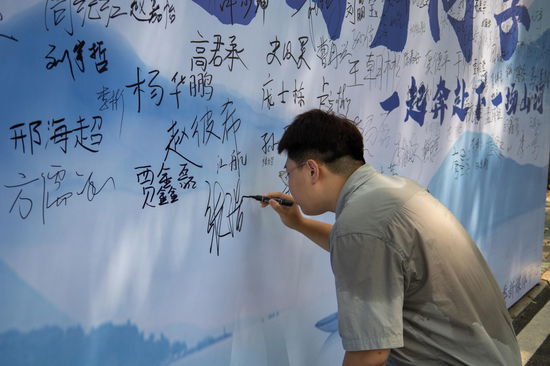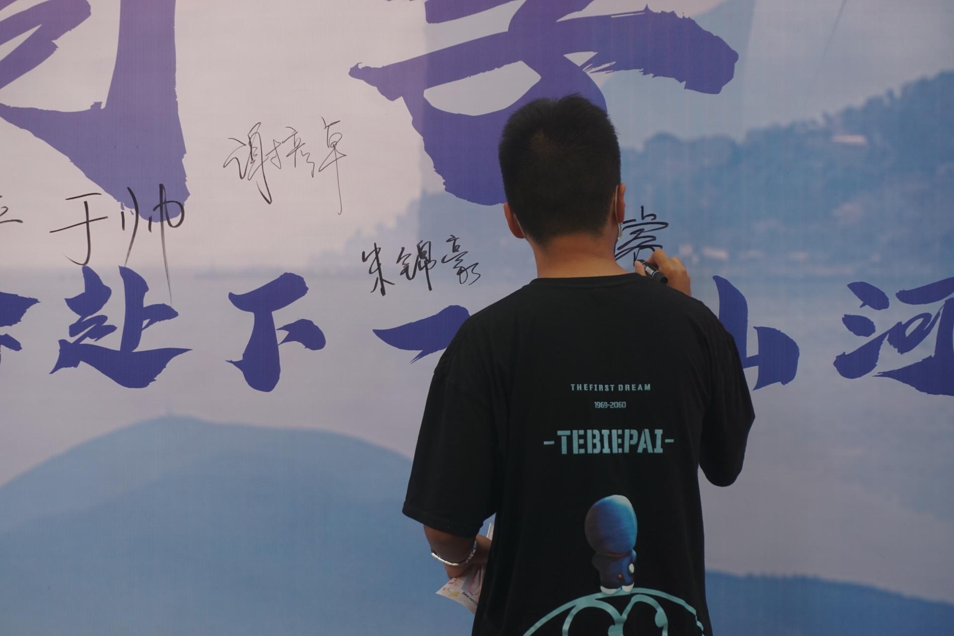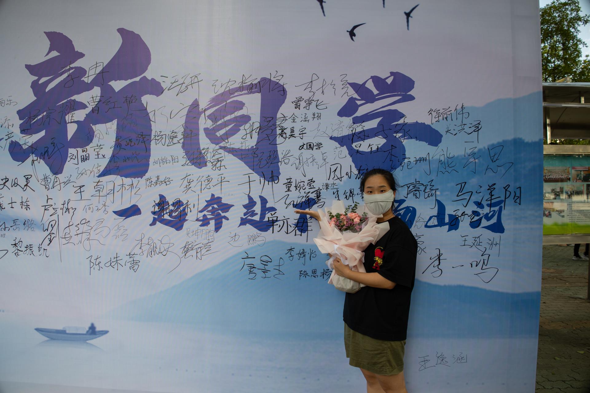 迎着朝阳,第一位同学在签名墙上留下了他的名字