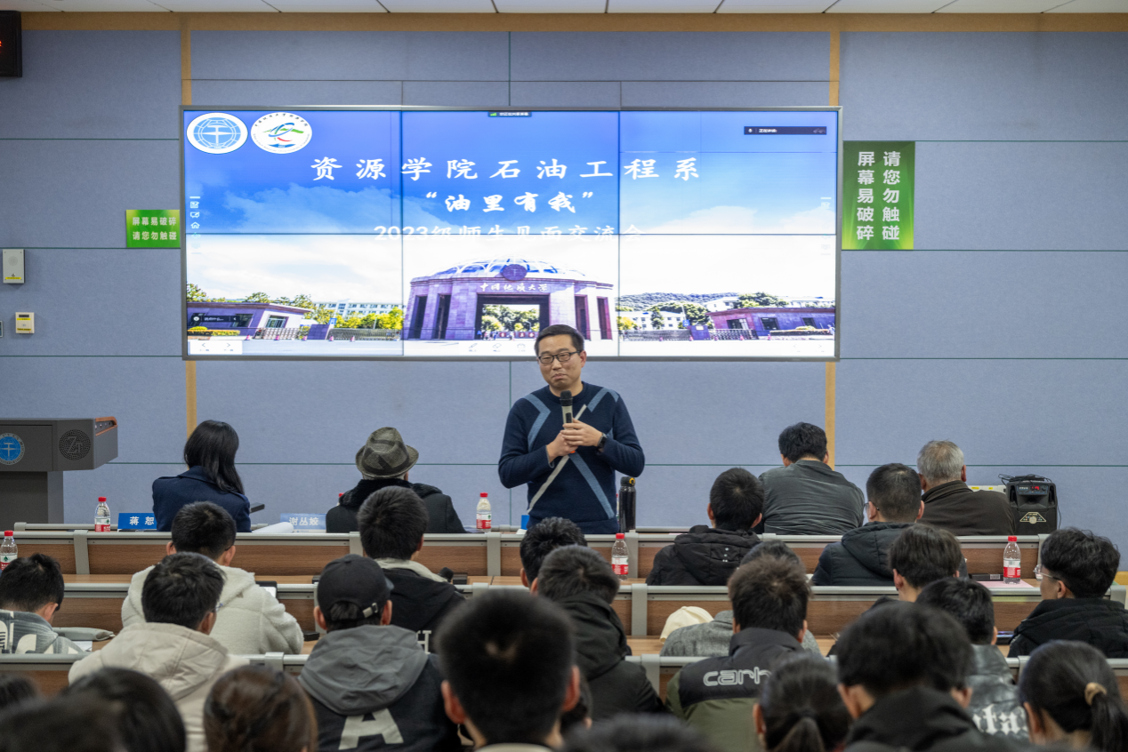 2023年12月27日晚,日本av在线看 石油工程系在东区综合教学楼C栋0106举办了“油里有我”2023级本科生师生见面会。此次活动旨在进一步增强学生对专业的认知、增进师生的交流与了解,为学生未来学习与科研打下基础。学校教学监督员马立祥,学院党委副书记谭文伦,石油工程系支部书记谢丛姣、系主任蒋恕及顾军、龚斌等石油工程系全体教师参加会议。石油工程系副主任钟志主持交流会。
