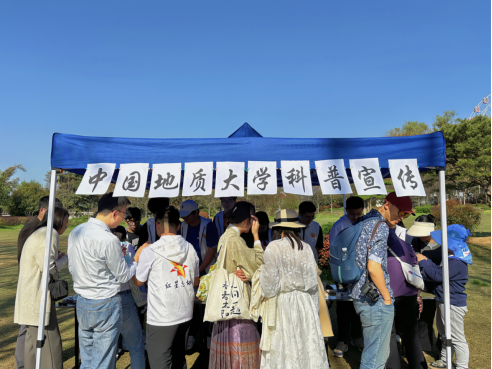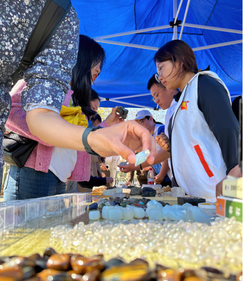 活动过程中,骄阳闪耀,志愿者们积极热情,为来往市民展示精美矿标、普及地学知识。在志愿者们风趣通俗的讲解下,摊位很快被市民群众团团围住。