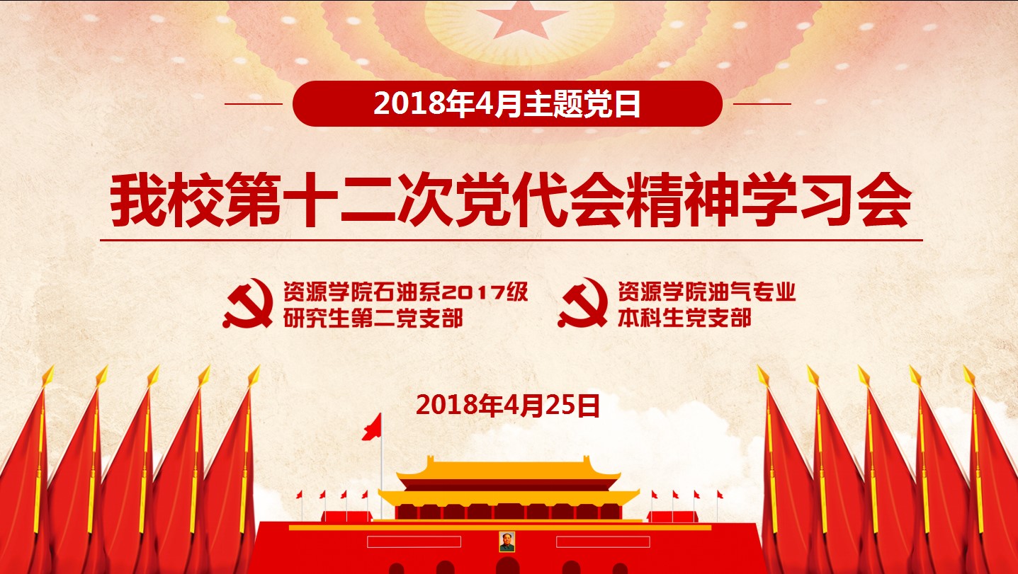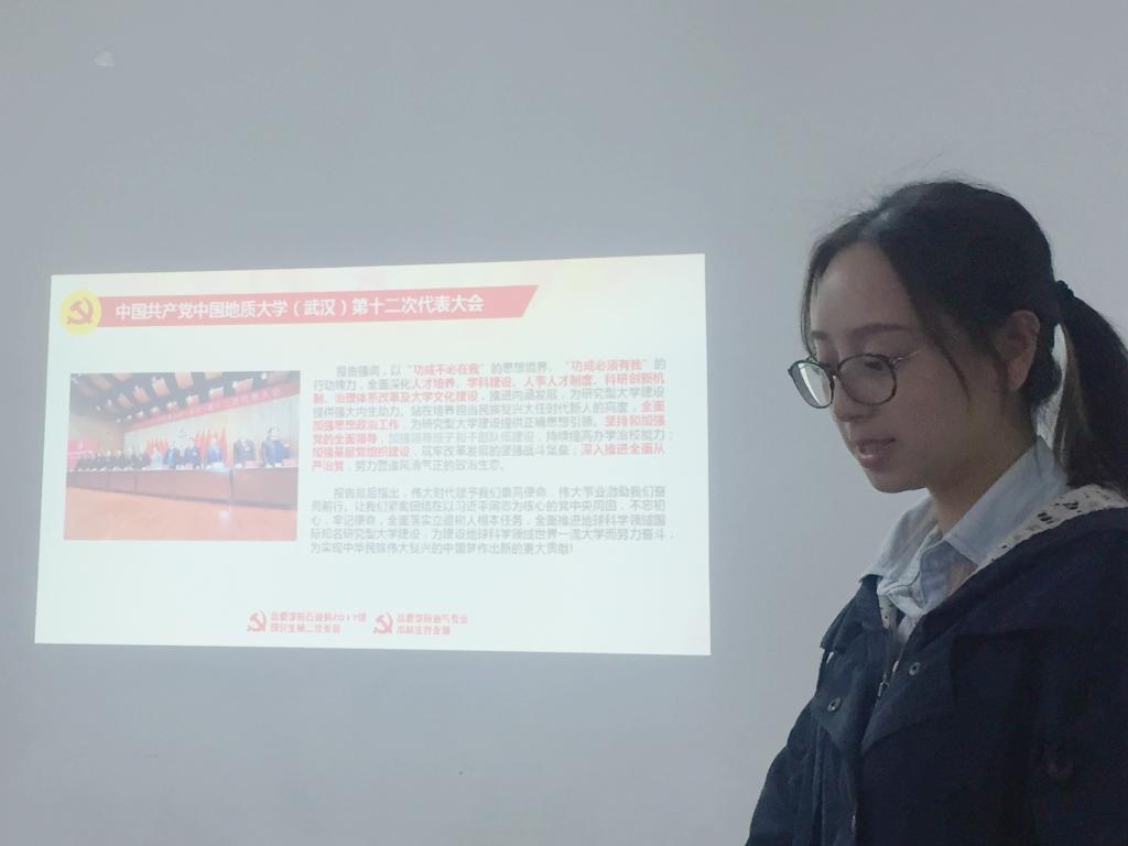 第十二次党代会精神,包括会议主题、会议报告提纲以及提出的奋斗目标等内容,并提出与会党员应充分发挥先锋模范作用,为建校一百年时实现“建成地球科学领域世界一流大学”的地大梦添砖加瓦。