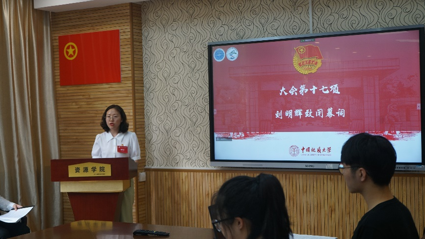 刘明辉致闭幕辞。她希望全体代表以及全体同学以这次大会的精神为动力,树立起强烈的历史责任感,发扬“求实奋进,勇攀高峰”的院风学风,践行“求是创新,厚德奉献”的资源人价值观,为保障国家资源能源安全和实现中华民族伟大复兴的中国梦贡献青春力量。