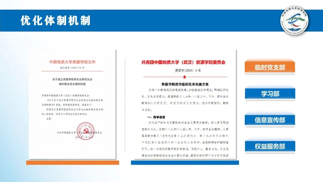 优化体制机制。我们成立临时党支部,持续增强学生会组织政治属性;结合全国学联要求,进一步优化组织架构,激发组织活力;规范召开学代会,凝聚青年智慧。