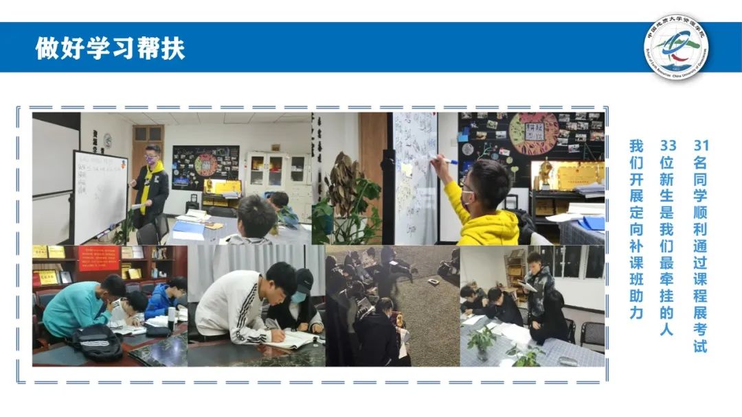开展定向帮扶。2021级33位新生没有学过化学,成了我们最牵挂的人,我们新设“定向补课班”,一学期后,31名同学顺利通过课程考试。我们持续开设基础科目辅导,为学业困难同学解决实际问题。