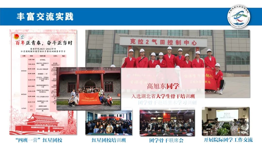 丰富交流实践。四班一营红星团校做到系统培训全覆盖;开展年度骨干联席会,交流共进;与兄弟学院开展工作交流,互学互鉴;团学骨干走进矿山油田,砥砺报国之志。主席团成员高旭东更是入选省大骨班。