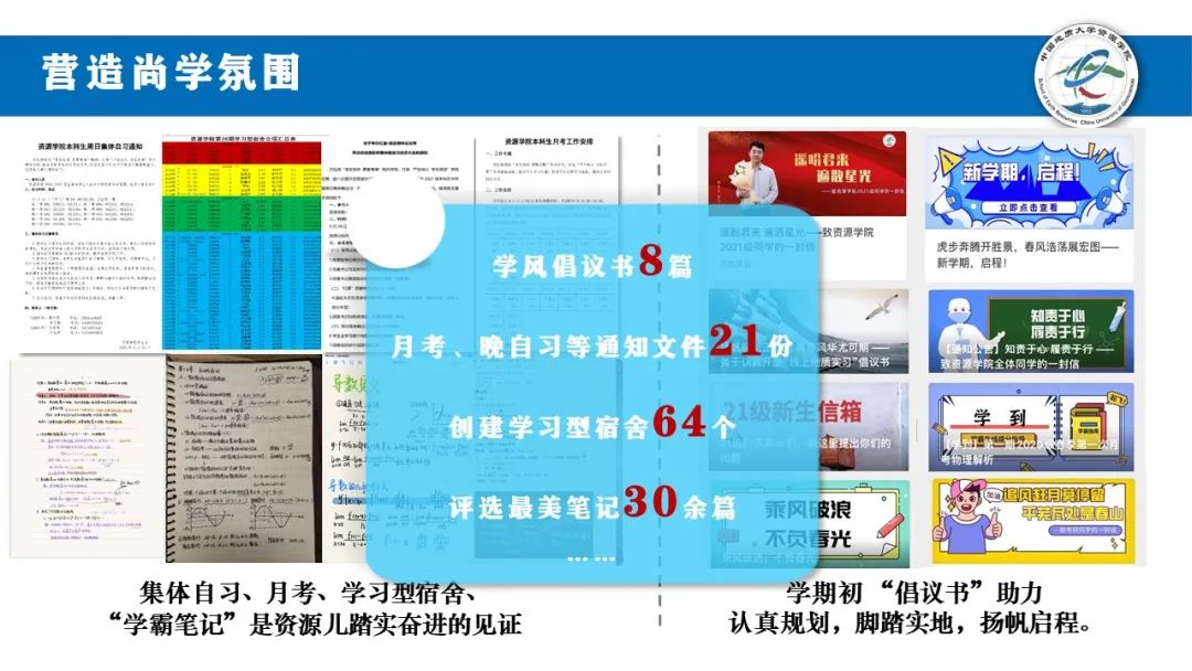 我们营造尚学氛围。在学期初、考试月发布学风倡议书8篇;发布月考、晚自习等通知文件21份;成功创建学习型宿舍64个,打通学风建设最后一公里;精心设计学到栏目,邀请任课老师、高分选手分享学习秘籍;评选最美笔记30余篇,拿出课堂笔记的样板。