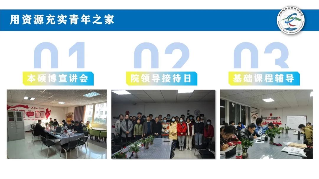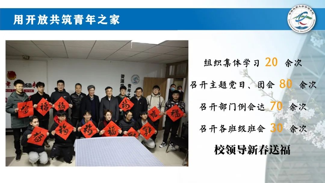 做好青年之家预约共享,累计召开主题党日、主题班团会、部门例会200余次,用开放共筑青年之家。青年之家成为了资源学子的打卡地,校长也走进青年之家,送上新春祝福,分享成长故事,勉励资源学子专业报国。