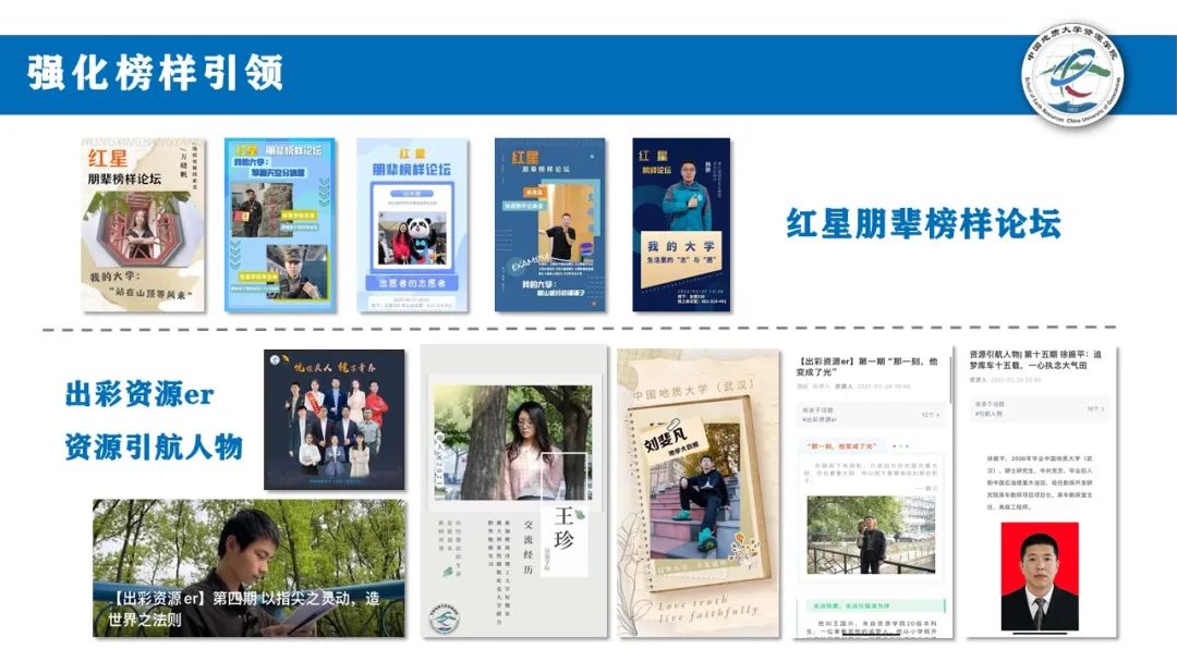 青年榜样最有说服力,青春话语最是动人心。我们打造《资源引航人物》《出彩资源er》,推出《红星朋辈榜样论坛》,学霸大神、双创达人、优秀校友走进同学,激励资源学子勤学、乐学。