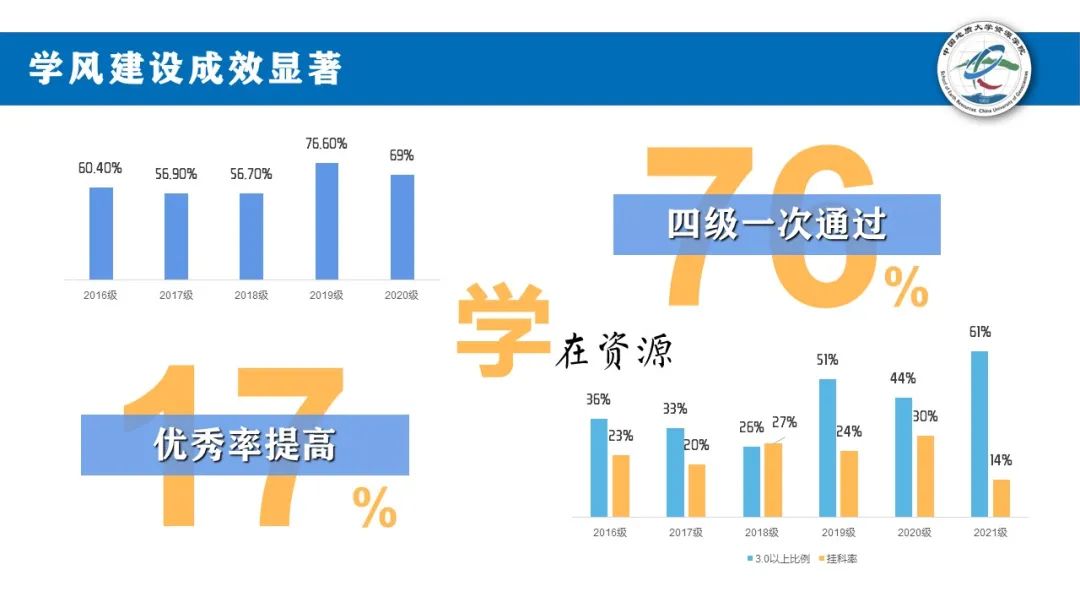 经过努力,2021级优秀率达61%。2019、2020、2021级第一学期优秀率较同期提高20%—30%。此外,2019、2020级四级一次性通过率较以往提高15%—25%。